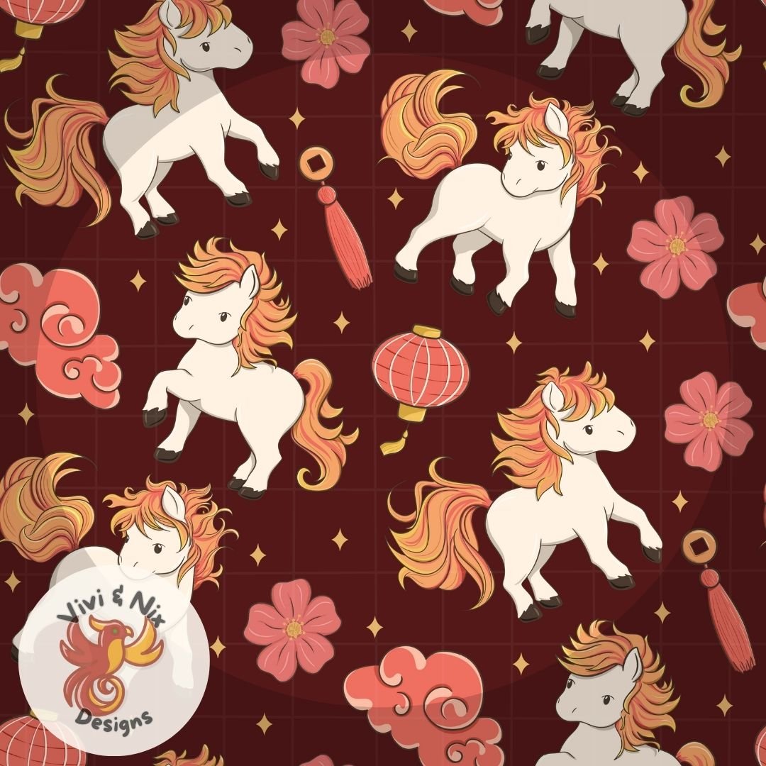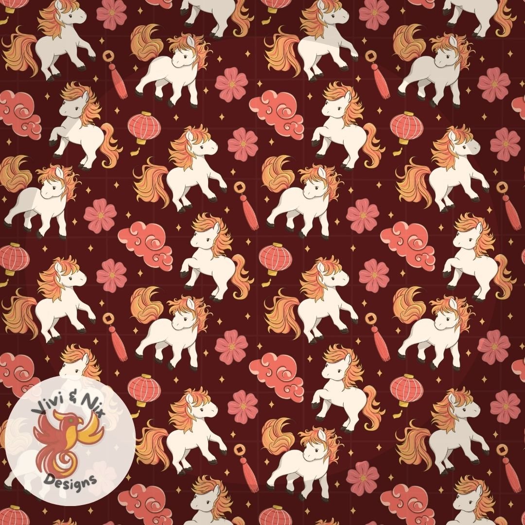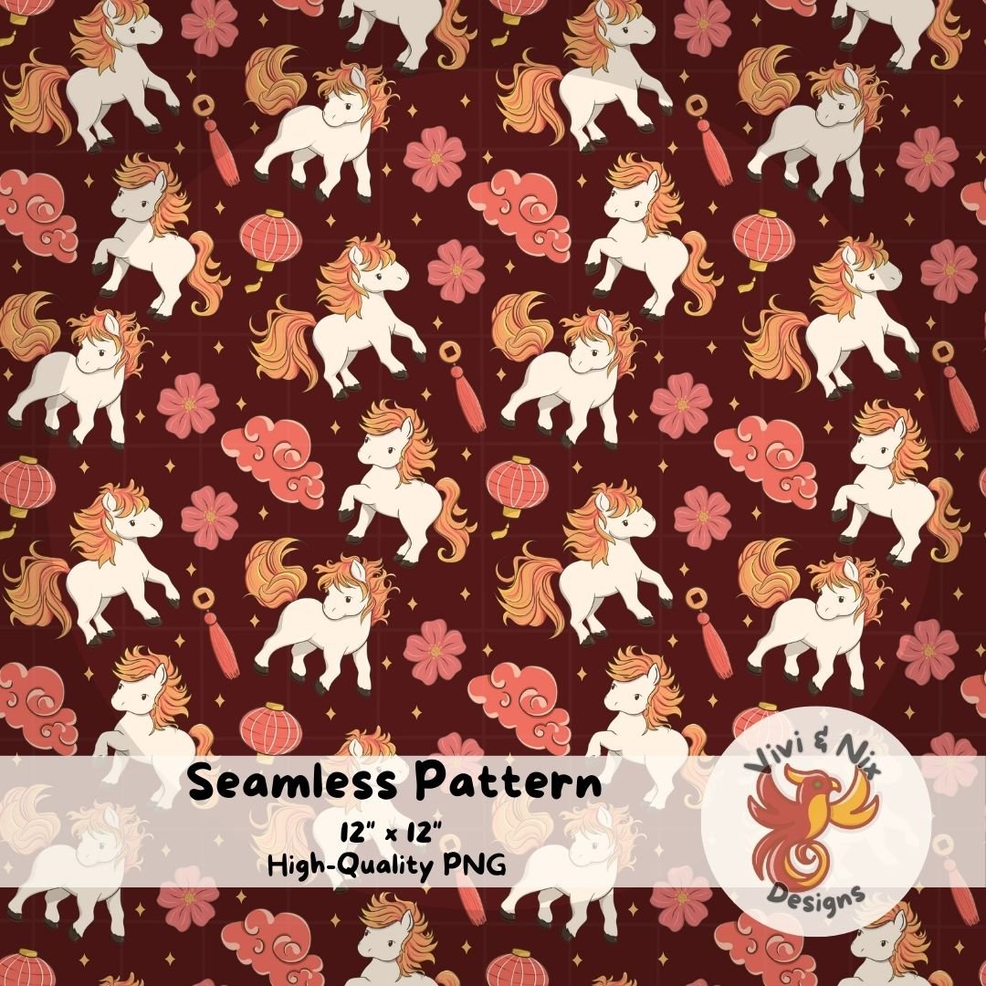 Celebrate the Year of the Fire Horse with this cozy, hand-drawn seamless pattern featuring playful ponies, lanterns, clouds, florals, and warm red-gold tones. This design is perfect for Lunar New Year projects, children’s items, fabric printing, and festive handmade goods.