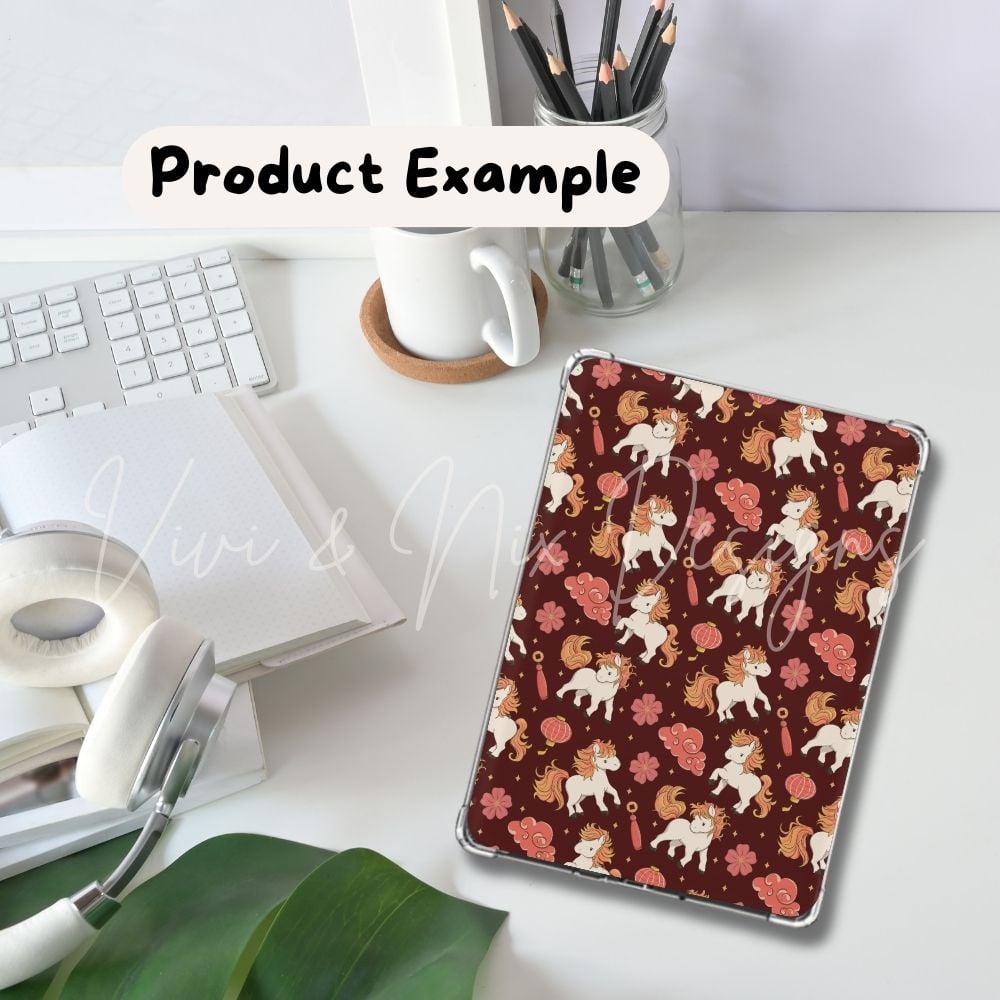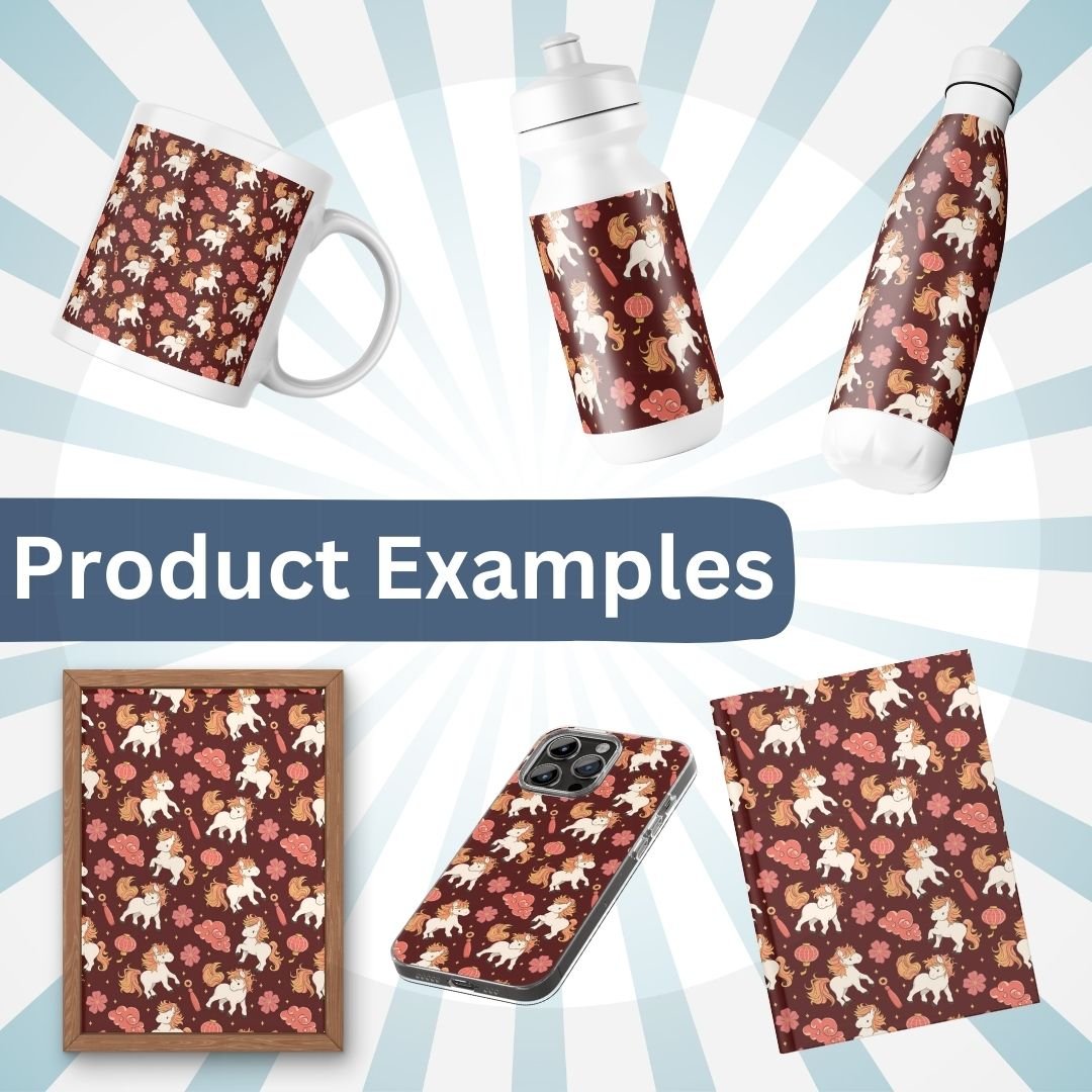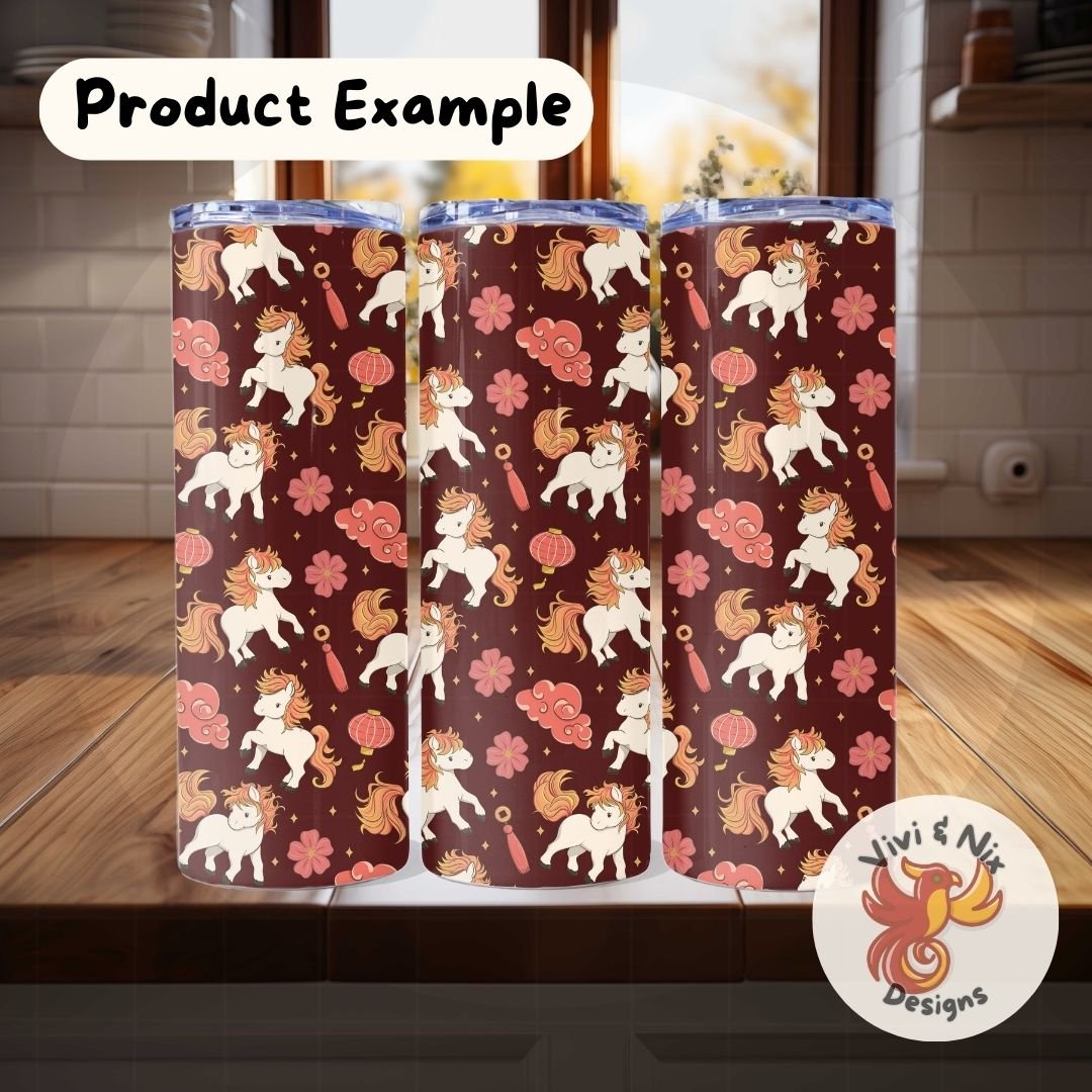 Celebrate the Year of the Fire Horse with this cozy, hand-drawn seamless pattern featuring playful ponies, lanterns, clouds, florals, and warm red-gold tones. This design is perfect for Lunar New Year projects, children’s items, fabric printing, and festive handmade goods.
