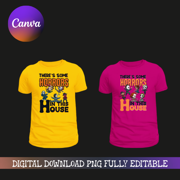 Get spooky and stylish with our "There's Some Horrors in This House" digital shirt design β a fun, Halloween-themed graphic perfect for horror lovers with a playful twist. Featuring chibi-style versions of iconic scary movie characters like Michael Myers, Chucky, Jason, Freddy, Pennywise, Beetlejuice, and Pinhead, this bold design is ideal for seasonal shirts, or digital merch, it balances spooky and cute, making it a standout for Halloween fun.