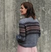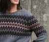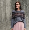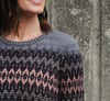This garment is worked top-down, with a modified Ziggurat construction - as developed by Åsa Tricosa - for the yoke. Initially the yoke is worked flat, until front neckhole depth is reached, at which point the work is joined in the round. The remainder of the garment is worked in the round, and the majority of the yoke and upper body and sleeves feature a striking colourwork pattern. The stranded colourwork uses four colours in total, but only a maximum of two on any given round. Once yoke depth is reached, stitches are separated into body and sleeves, each of which is worked in the round. Once the colourwork pattern is completed, the remainder of the body and sleeves is worked in stockinette and finished with half-twisted ribbing. Stitches are picked up around the neckhole to form a half-twisted ribbing neckband.
