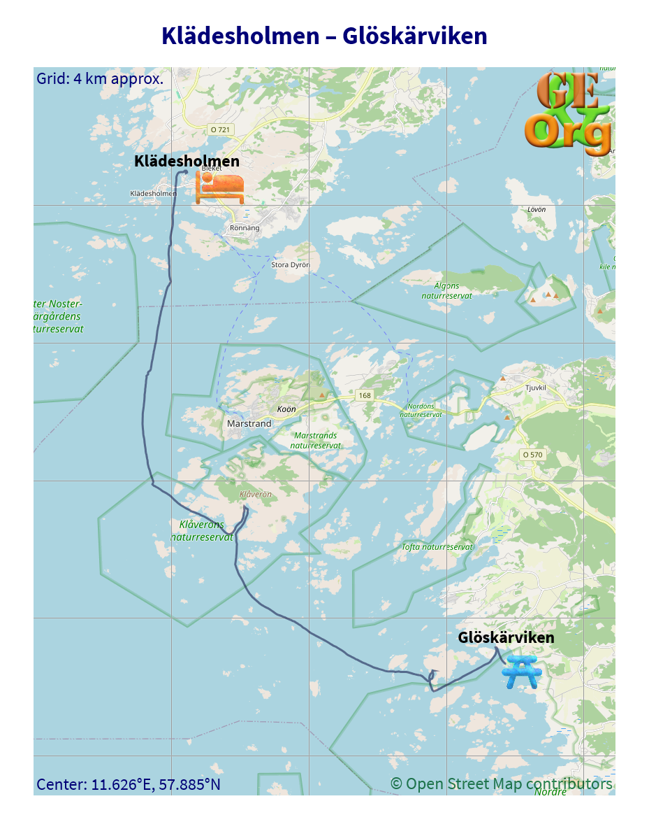 Paddling tour Klädesholmen to Glöskärviken, Sweden, one GPX file, one GeoJSON file, one OpenStreetMap.