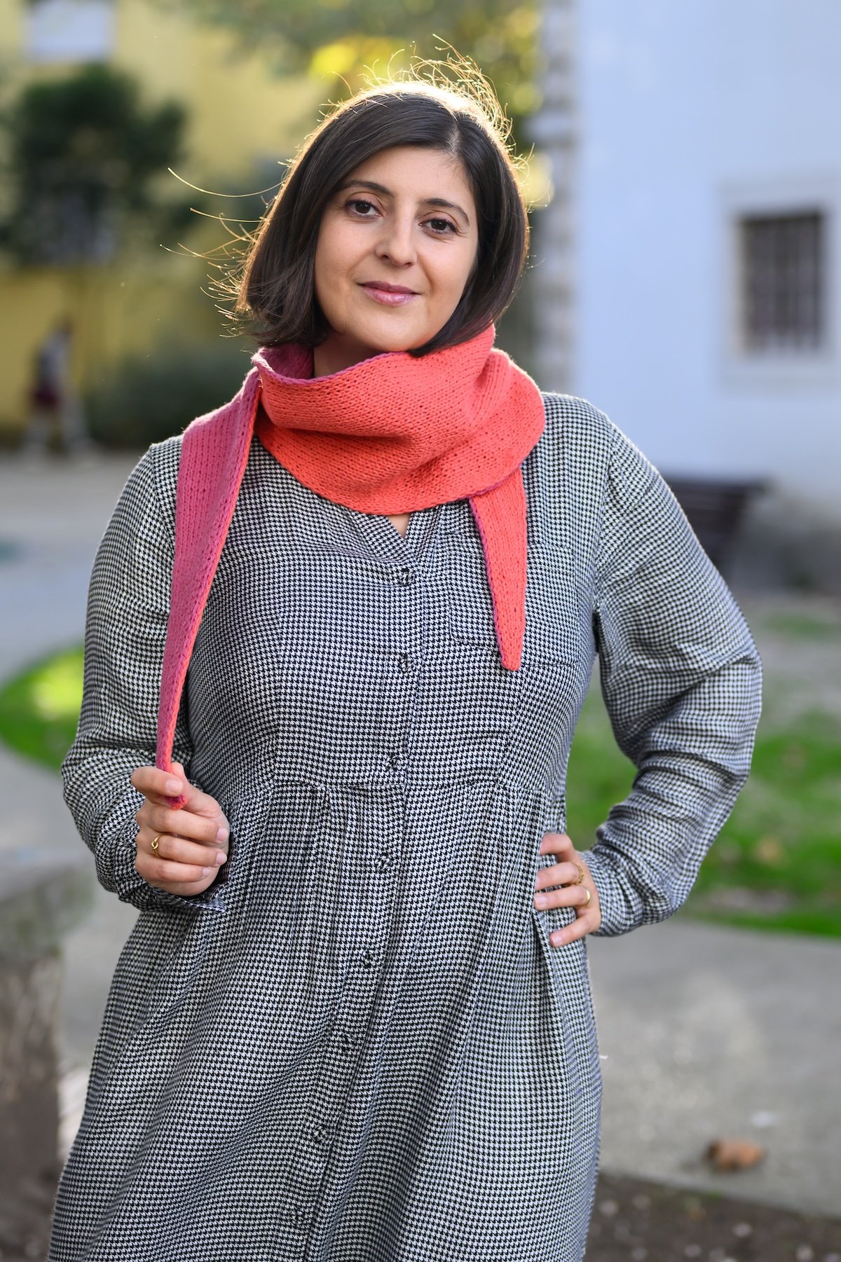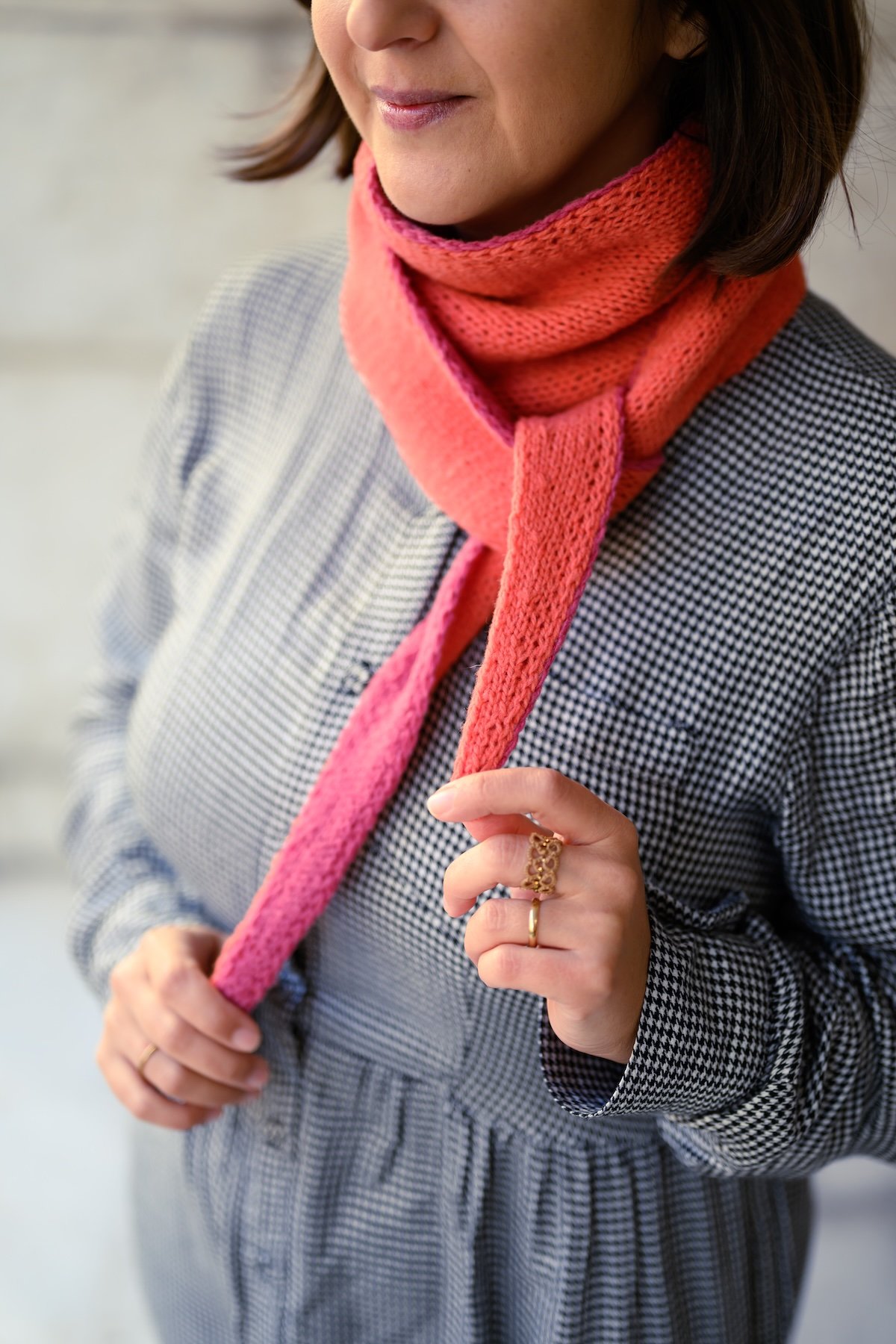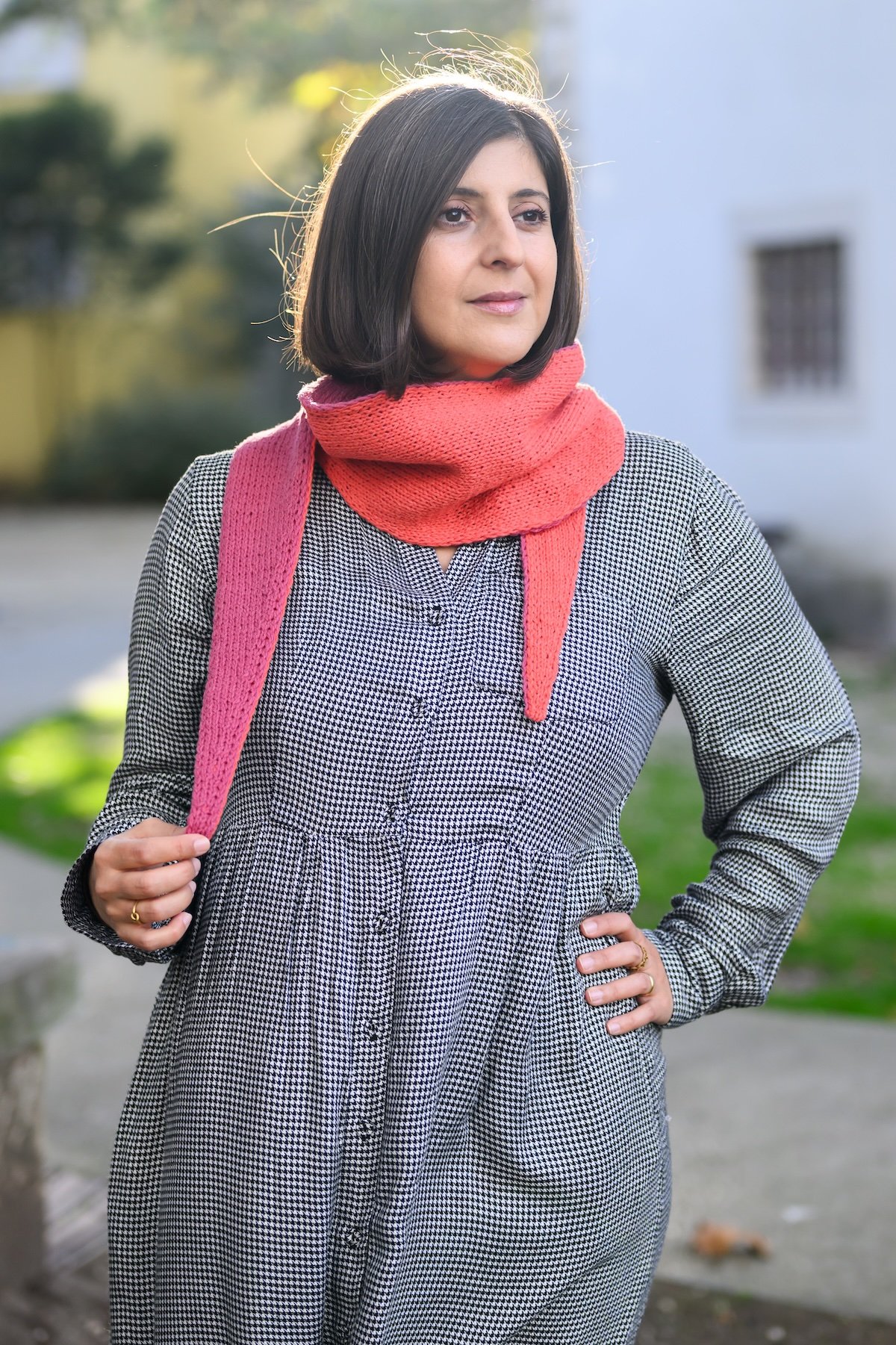 Inspirado en el Pompelmo (pomelo en italiano), este chal presenta un naranja vivo por un lado y un rosa cálido por el otro. Este chal está tejido con la técnica de punto doble (double knitting), lo que significa que toda la pieza está en punto jersey con un lado de cada color. El chal se trabaja de lado a lado, es decir, empezamos el chal por un extremo, con sólo 6 puntos, y trabajamos con aumentos hasta el centro del chal. Luego se trabaja con disminuciones hasta el final. Las fotos muestran la talla 2 del chal.