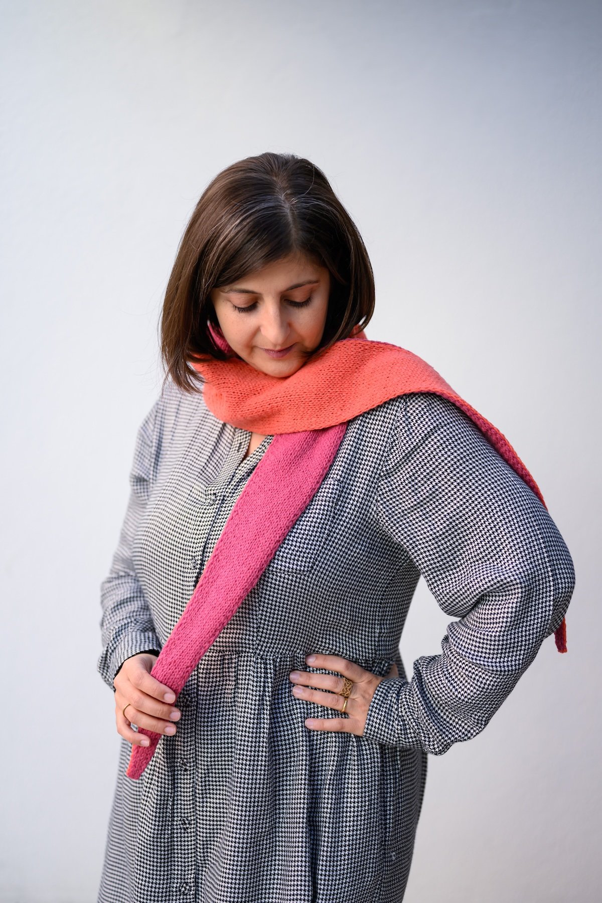 Inspirado no Pompelmo (toranja em italiano), este xaile apresenta um laranja vivo de um lado e um rosa quente do outro. Este xaile é tricotado em ponto duplo, o que significa que toda a peça é tricotada em ponto jersey com um lado de cada cor. O xaile é tricotado de um lado ao outro, o que significa que começamos o xaile numa extremidade, com apenas 6 malhas, e trabalhamos com aumentos até ao centro do xaile. Depois, tricotamos com diminuições até ao fim. As fotos mostram o tamanho 2 do xaile.