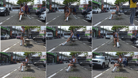 Caterina sitzt auf einer Bank in der Innenstadt, während mehrere Autos und Menschen an ihr vorbeifahren.