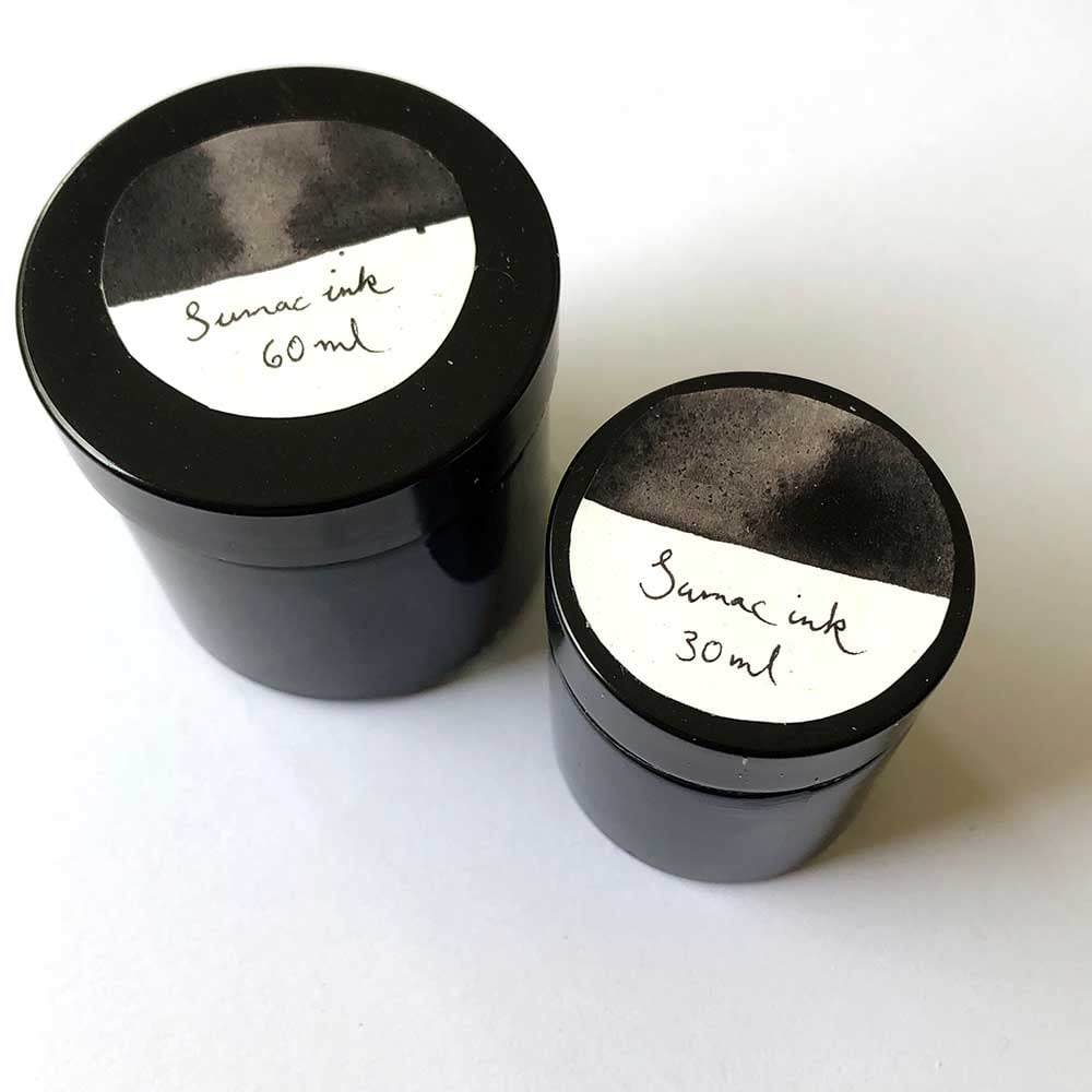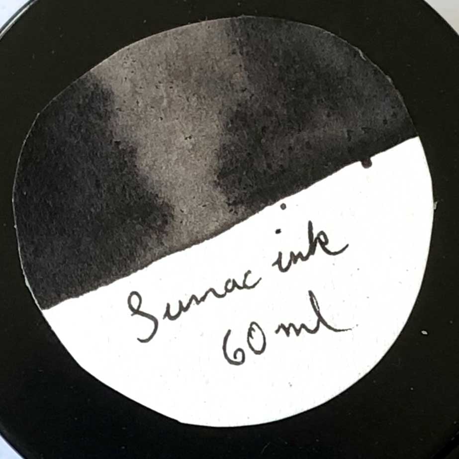 This ink is made from sumac drupes, which are usually dried and used as souring agent in food. They are are rich in tannin and produce warm, faintly purplish greys.