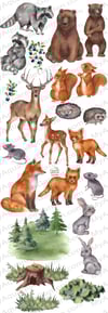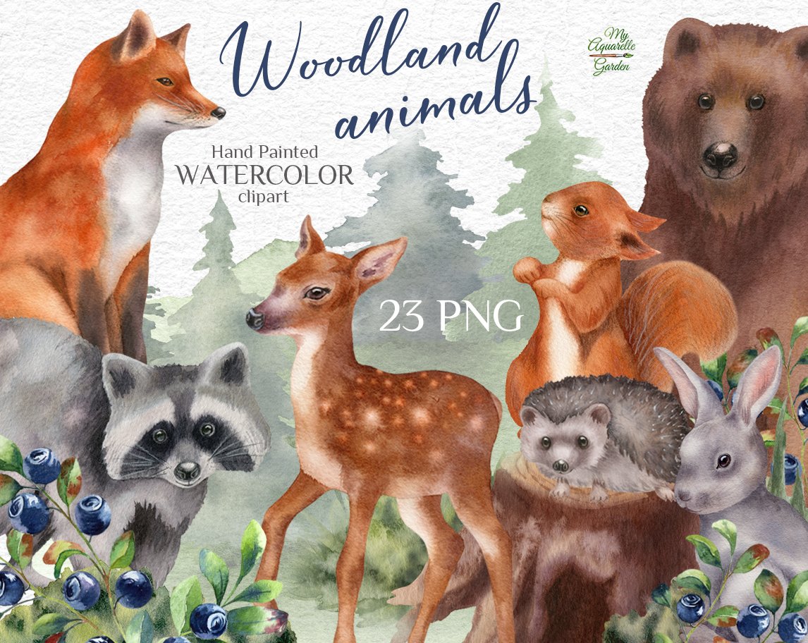 Woodland animals and forest plants. Bear, bear cub, fox, fox cub, raccoon, deer, fawn, hare, hedgehog, mouse, squirrel. Also grass, stump, firs, blueberry twigs