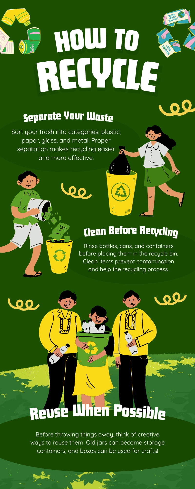 Discover our Green and Yellow Illustrated How to Recycling Infographic, the perfect visual guide for anyone who wants to make eco-friendly habits simple and enjoyable. Designed with clear steps and vibrant colors, this infographic is ideal for classrooms, offices, community programs, or anyone looking to learn how to recycle properly with easy-to-follow instructions.