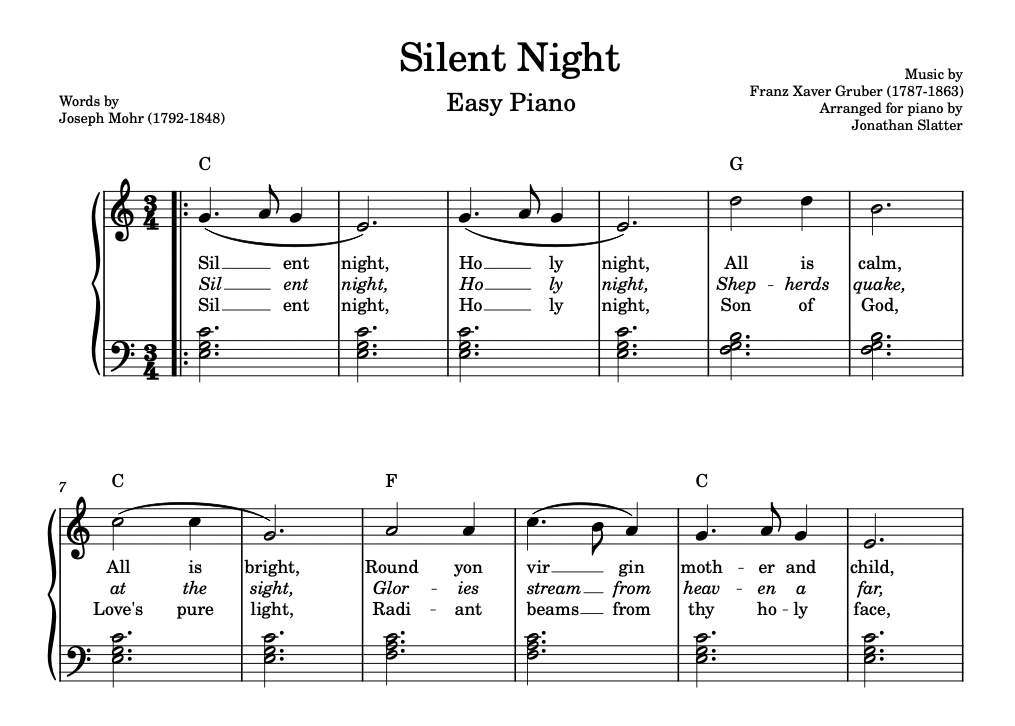 Silent Night Christmas Carol arranged for Easy Piano - Beginner. Singalong or add violin, flute etc