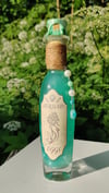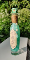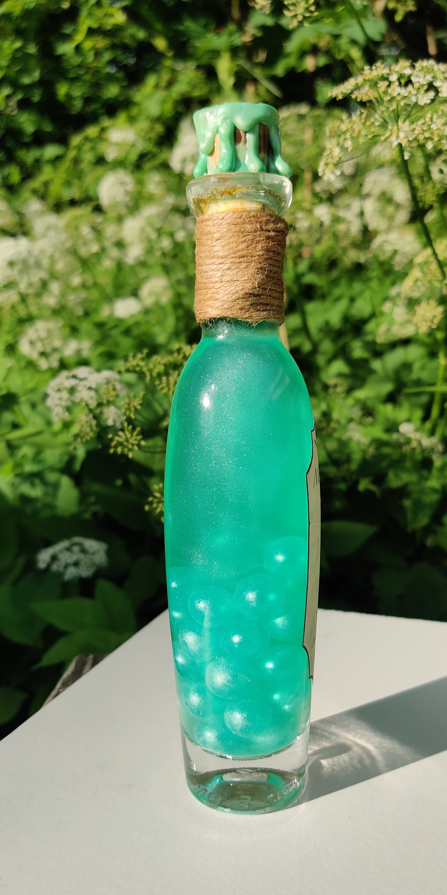 Pullossa on turkoosia nestettä ja se on koristeltu käsintehdyllä etiketillä ja juuttinarulla sekä helmiyksityiskohdalla.