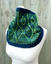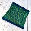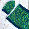 The Pavonis Cowl is knit from the top down using only one colour yarn per round. Slipped stitches and delicate cables are used to create the eye-catching ‘feathers’ that flow down the length of the cowl.