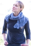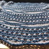 A 2 color striped crescent shawl, featuring short row and eyelet accents.