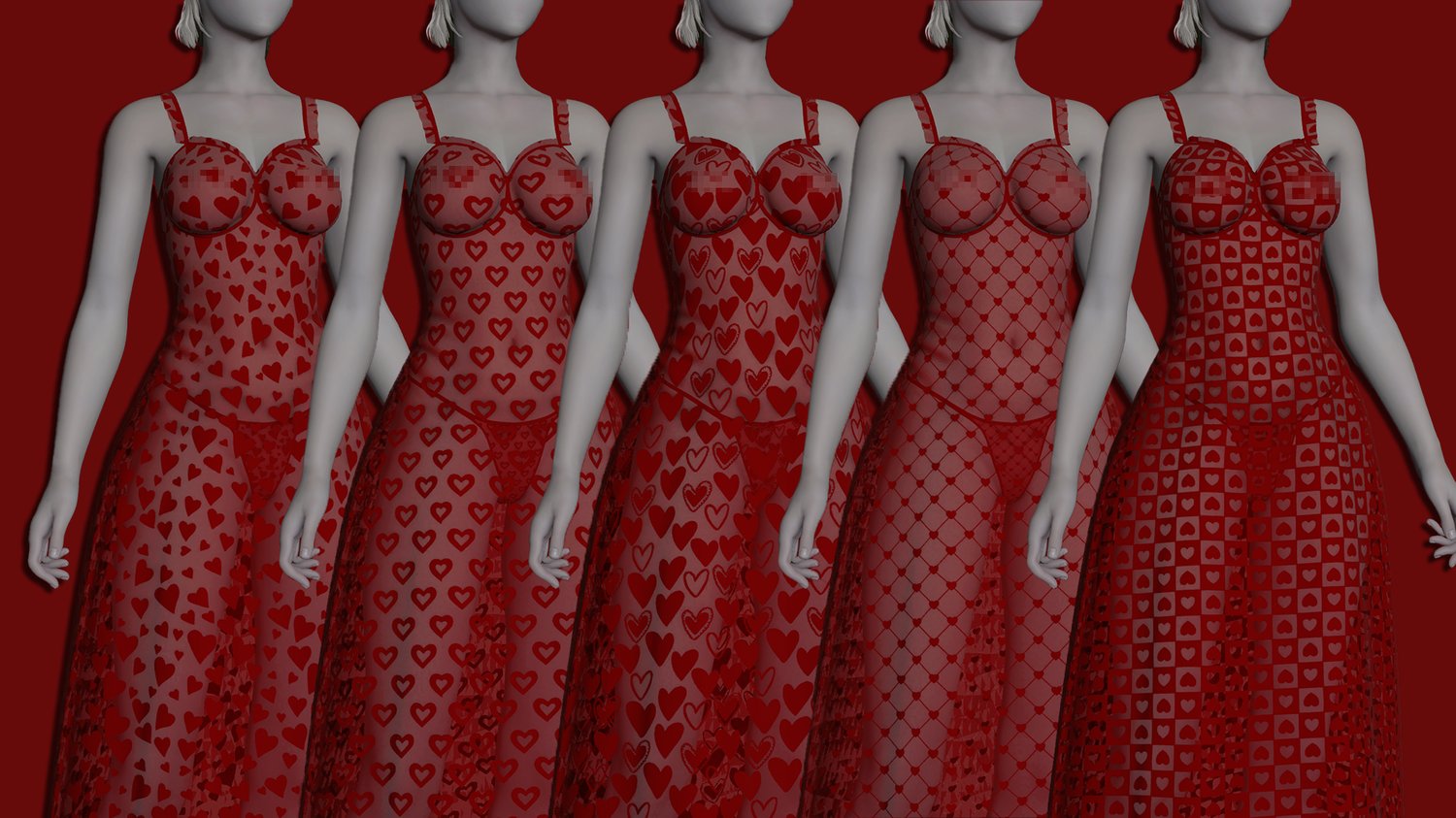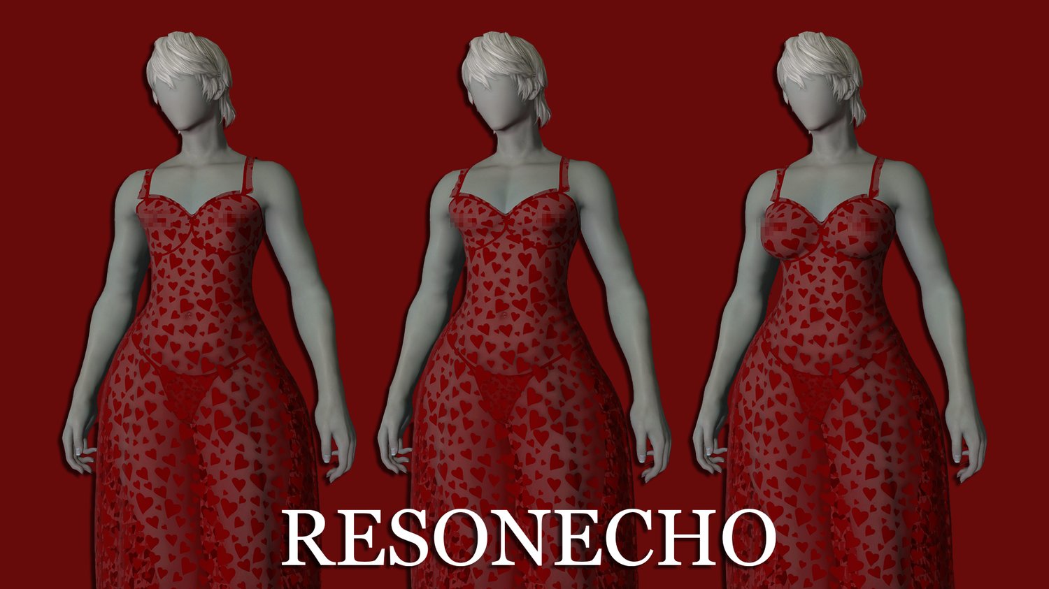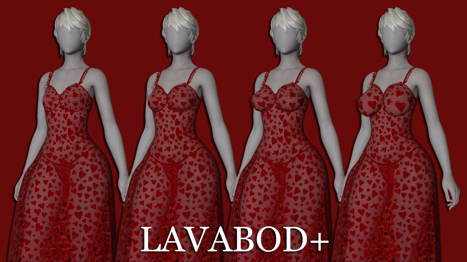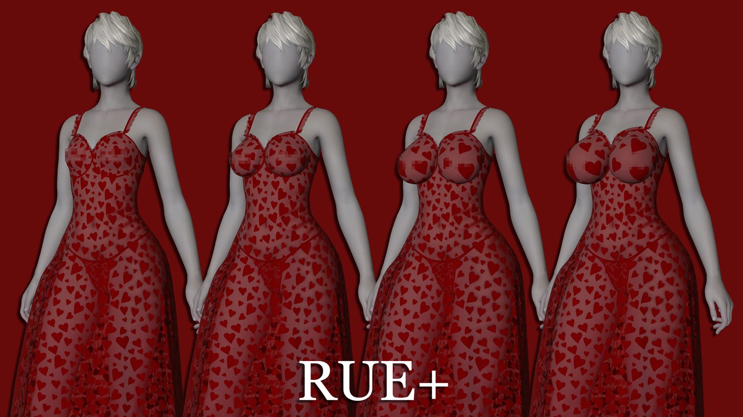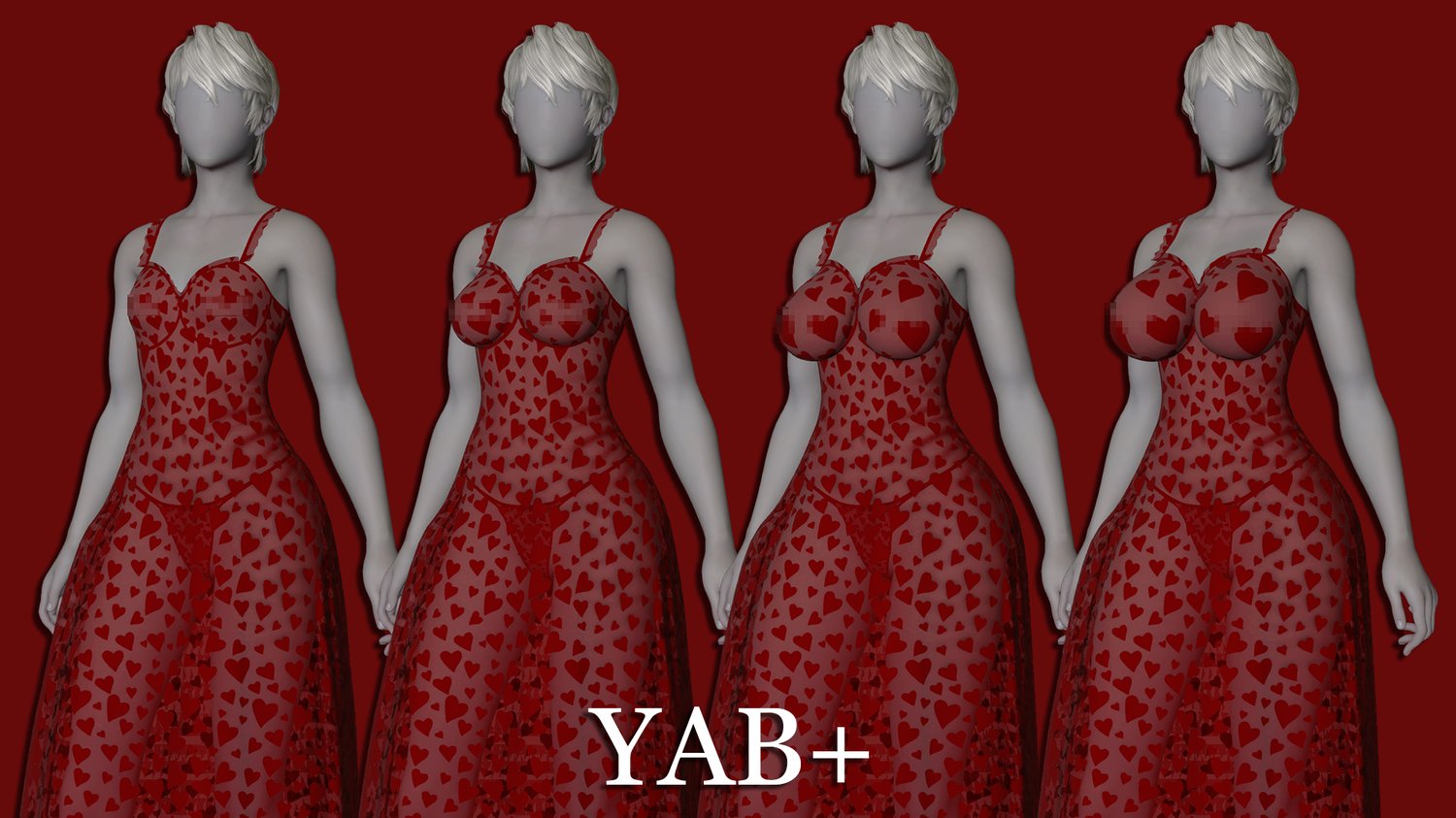 Dress comes with panties, contains five heart patterns, includes BPF and piercing support, and just uses one dye channel. YAB+ and Rue+ versions feature small and large skirt clearance options, alternative hip toggles, and introduces a smaller butt option that can be toggled via shpx.
