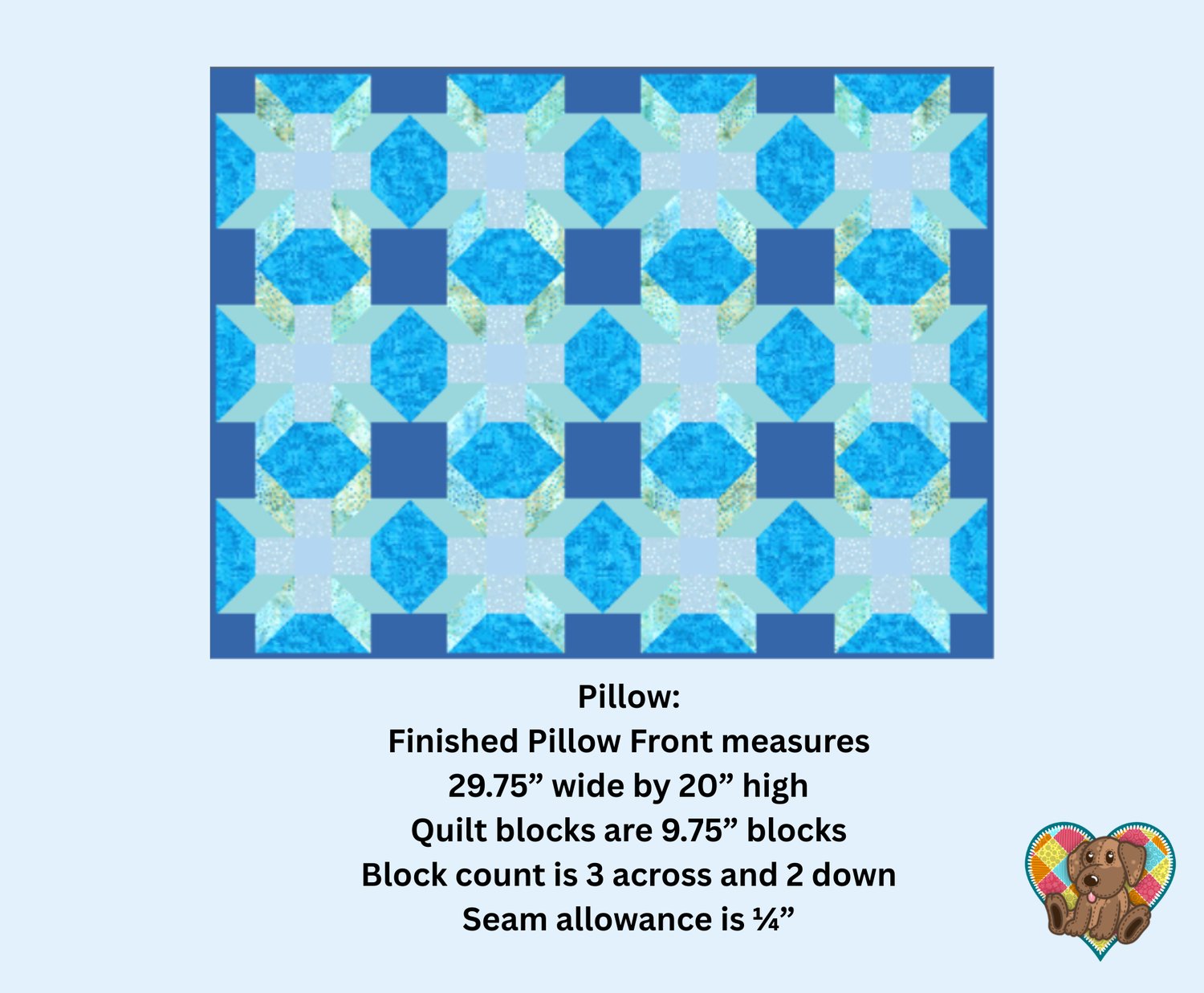 Pillow sham quilt front pattern is 20" X 29.75" Blocks are traditional pieced blocks.