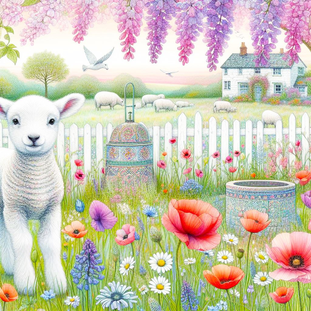 Adorable lamb in a meadow with long grass & poppies, bluebells, & daisies. There is a wisteria tree & in the distance there is a small cottage. There is a wishing well with patterned mosaic tiles.