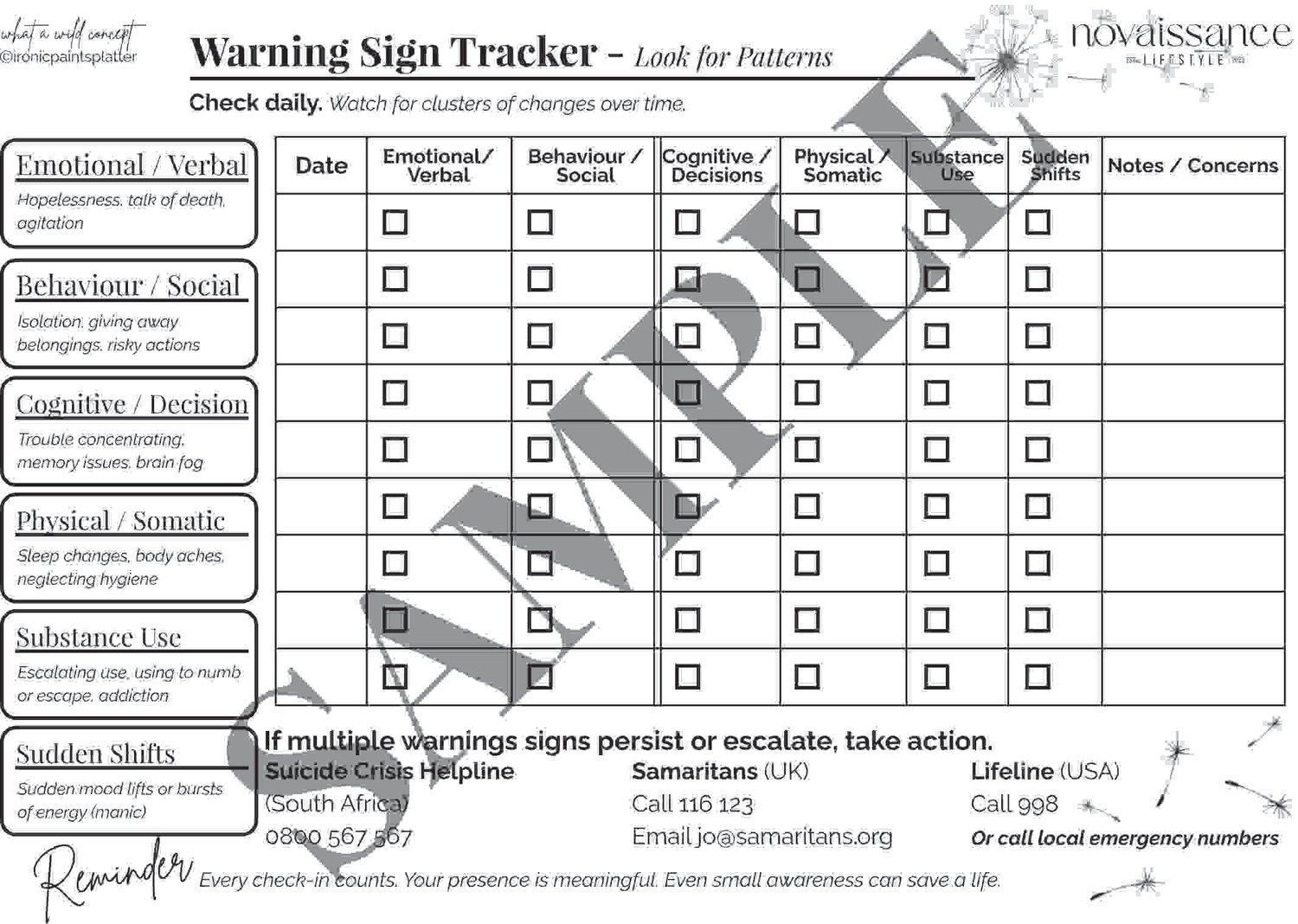 - Warning Signs Reference: Quick reminders of behaviors and patterns to watch for, so supporters can notice escalation early.