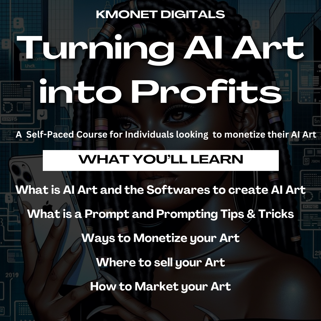 Step into the exciting world of AI art with our comprehensive and self-paced course, 'Turning AI into Profits.' This instant-download course spans across detailed pages, packed with insightful knowledge on generating AI images, selling them in the booming digital market, and effective marketing strategies to amplify your reach and sales. Perfect for both beginners and experienced creators, it covers a range of topics from the basics of AI art creation to advanced monetization techniques including platforms like NFT marketplaces and online art galleries. Whether you're looking to explore new artistic horizons or keen to monetize your creative prowess, this course is your key to unlocking the full potential of AI art. Get your hands on this treasure trove of information and start transforming your AI art into a profitable venture today!