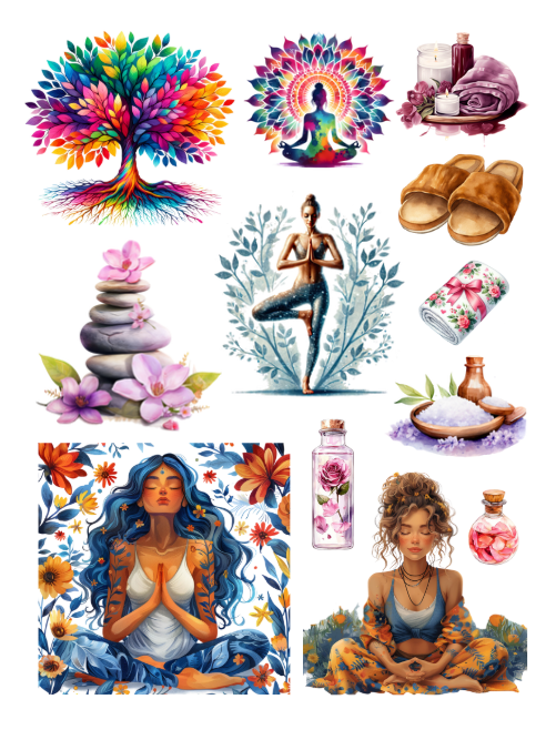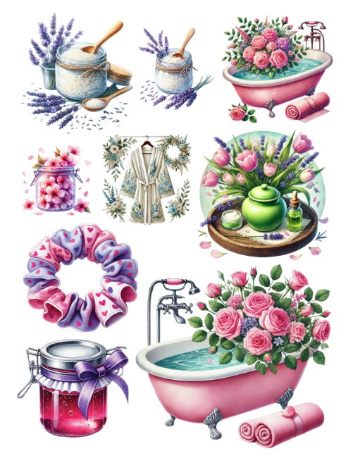 This beautiful book features spa day ephemera including towels, spa wear, candles, bathtubs, massage tables, robes, slippers, soaps of all kinds, bath balls, meditation and yoga poses, angelic symbolism, warm cozy windows and scenes, perfumes, dressing tables, potions and aroma therapy, bamboo and stone patterns, wicker/bamboo patterns, and much more. Decorate your planner with these lovely ephemera pieces, it's all the rage!