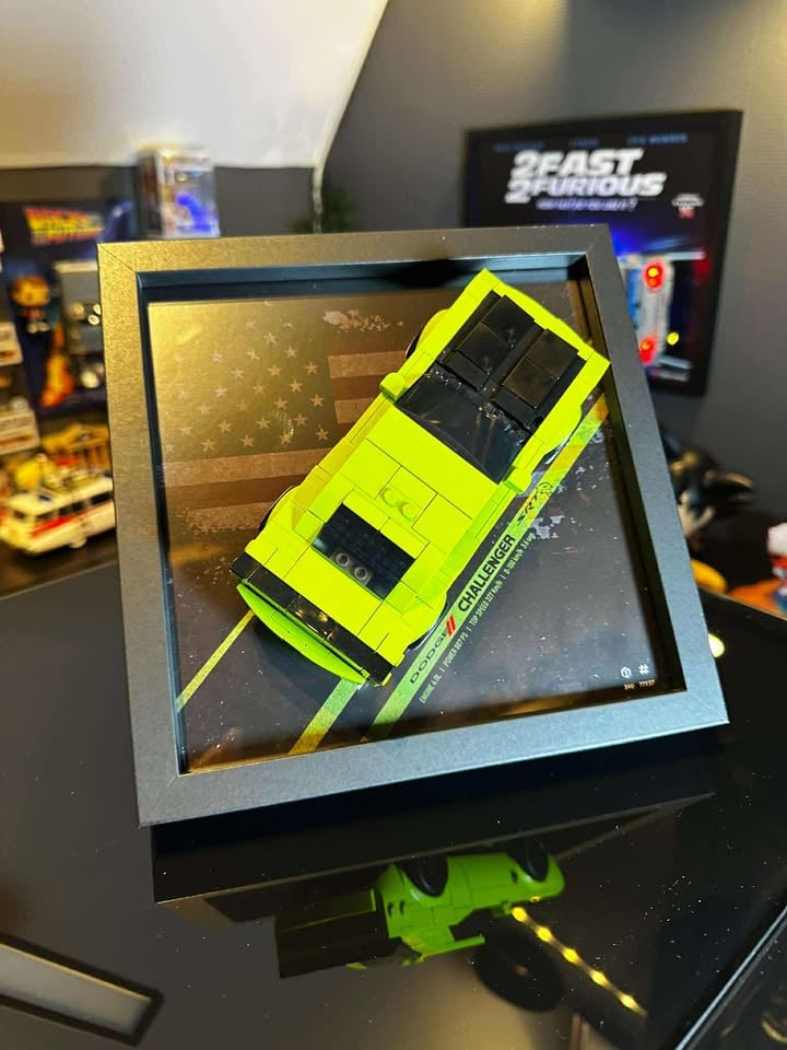 🔧 Créé spécialement pour mettre en valeur la Dodge Challenger SRT Hellcat LEGO Speed Champions (#77237), ce format 20x20 cm offre une présentation stylée et intense :