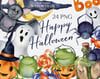 Happy Halloween decoration elements: vampire bats, frogs and toads, witch hat, bottle of deadly poison, candies and lollipops, ghosts, half moon, pumpkin caulderon, boo! sign, spiders, fearsome black clouds