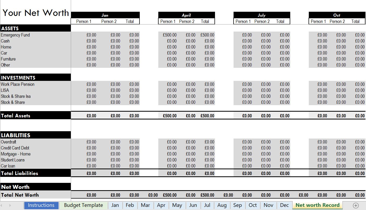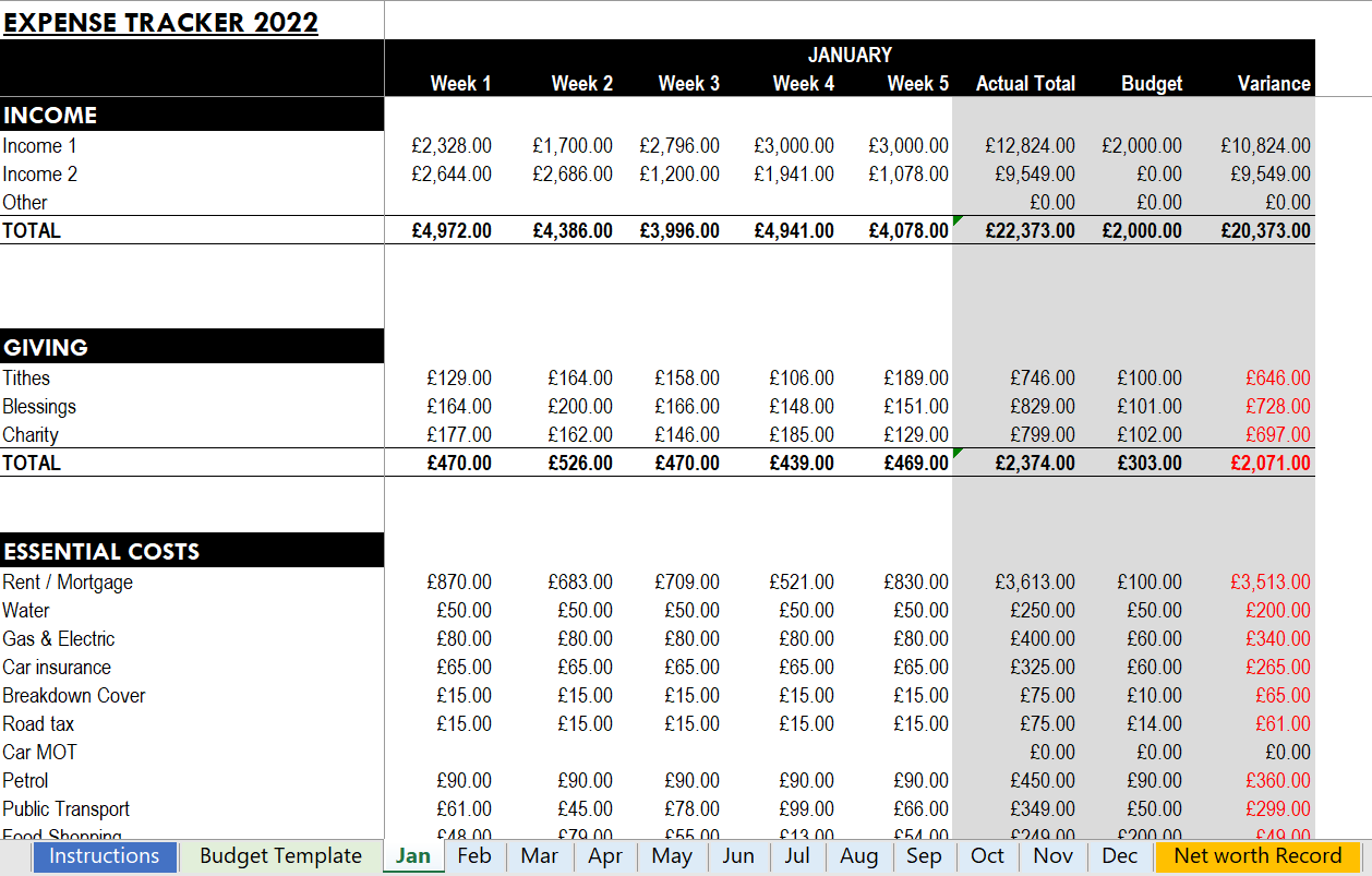 This simple but yet effective budget bundle takes away the hassle of creating a budget from scratch and provides user-friendly method to track your expenses and net worth. The budget bundle will help you set a budget for the year, keep track of your expenses on a weekly and monthly basis and the opportunity to up date quarterly record of your net worth, all in one place, just for you.