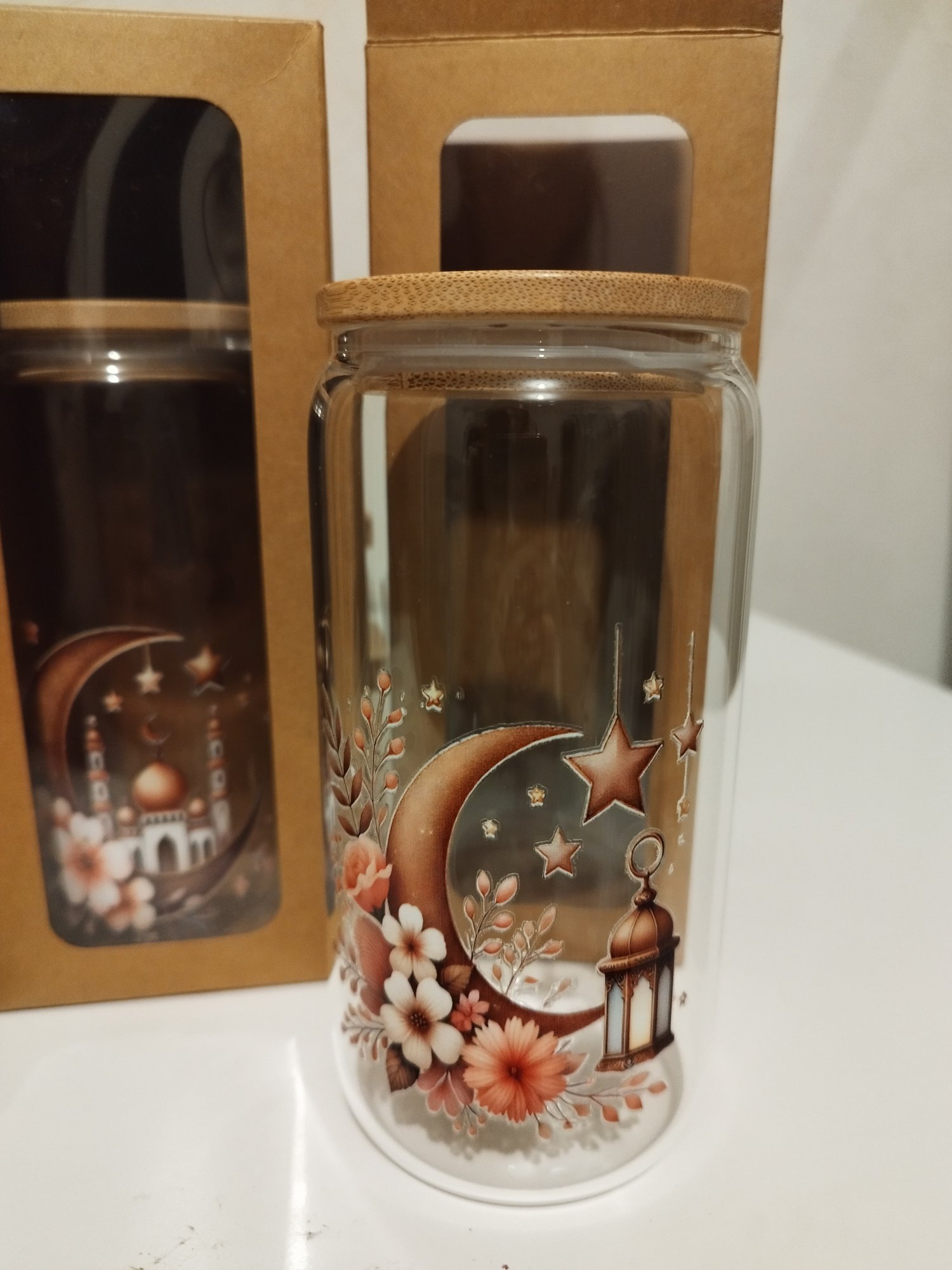 Chaque verre est orné d’une illustration délicate et chaleureuse : Coran, lune, mosquée et lanternes, créant une ambiance douce, spirituelle et apaisante, idéale pour le mois béni.