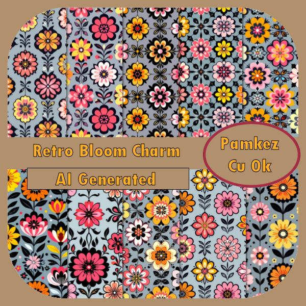 This set features a vibrant mix of mid-century inspired floral patterns in shades of pink, yellow, orange, and black on soft gray-blue backgrounds. Each seamless design combines cheerful folk-art blooms with a touch of modern elegance — perfect for adding warmth and color to your creative projects.