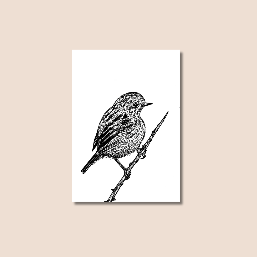 A postcard/mini art print of a "Stonechat" from the 2024 Bird Fest Challenge.