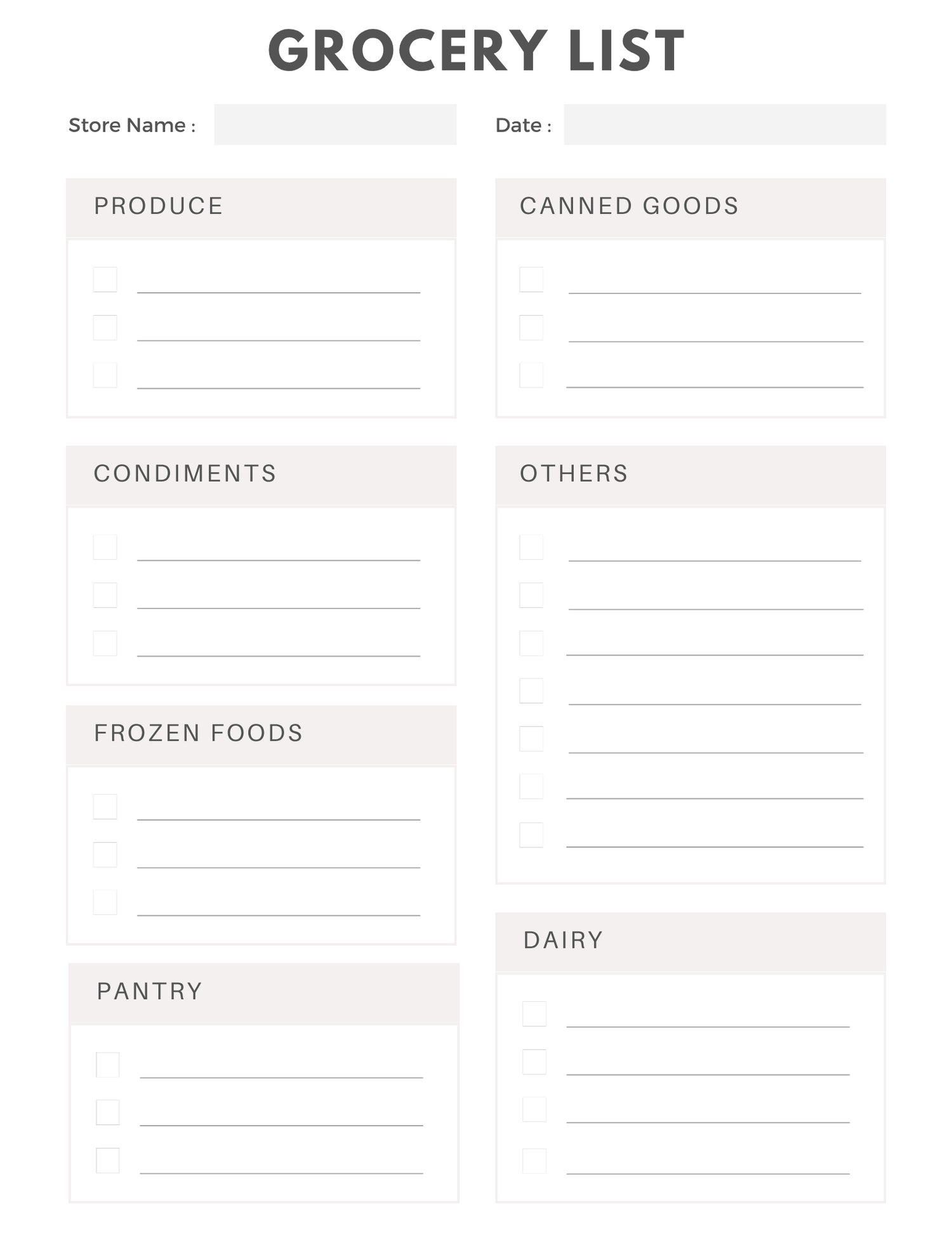 - Grocery List: Plan your grocery runs with organized sections for every category.