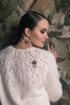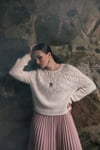 This pullover was inspired by Kuutar-jewelry by Kalevalakoru from Finland. The pattern was originally published in Kalevala X Novita knitting magazine, November 2022. The sweater features lace and bobbles that are imitating the Kuutar-necklace.