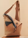 - On the back of LAPEL - a zippered pocket at an angle that mimics the fold of the lapel, an accent secures a ring for the cross-body strap and a third accent secures the other half of the closure
