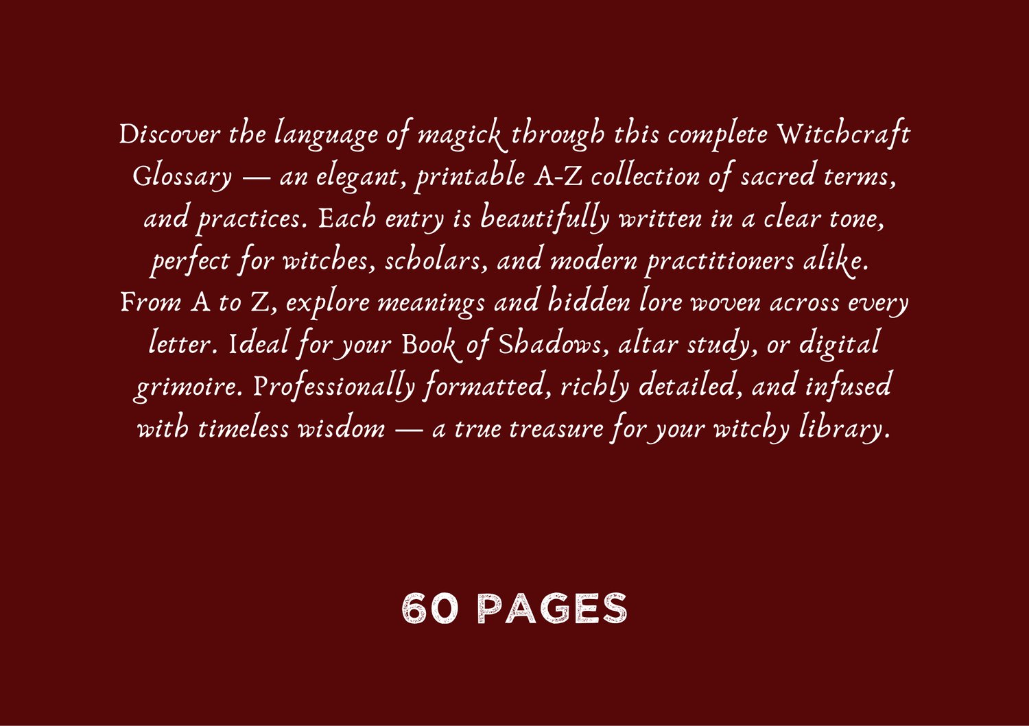 Discover the language of magick through this complete Witchcraft Glossary — an elegant, printable A-Z collection of sacred terms, and practices. Each entry is beautifully written in a clear tone, perfect for witches, scholars, and modern practitioners alike. From A to Z, explore meanings and hidden lore woven across every letter. Ideal for your Book of Shadows, altar study, or digital grimoire. Professionally formatted, richly detailed, and infused with timeless wisdom — a true treasure for your witchy library.