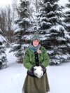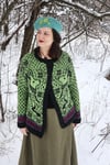 This is a pattern for a cardigan/jacket worked from the bottom up in the round and with a dropped sleeve featuring stranded colourwork and steeks. The sleeves are worked from the top down to cuff.