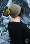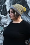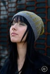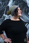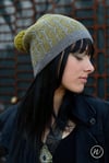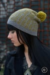 Shown in Stolen Stitches Nua [153yd/140m per 50g; 60% Merino, 20% Yak, 20% Linen] in shades Kitten Fluff (Yarn A) & Frog on the Wall (Yarn B)Shown in size 21in/53.25cm on model with 22in/56cm circumference head