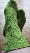 The pattern comprises two distinct cables; the central motif is worked over 24 sts, and the cabled side panels vary depending on the size of sock knitted. A smaller sock (worked over 48 sts) can be obtained by omitting the side cables entirely, please note that this would require adjustments to the heel and toe. Likewise, a larger sock (80 sts plus) could be created by adding additional stitches to the side panels and working these in pattern. Additional yarn may be required for larger sizes.