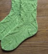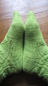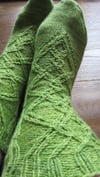 A top-down sock with traditional heel flap and rounded toe, decorated with delicate interwoven cables in a repeating pattern. There are three sizes available, with modular side panels accommodating these. The sample is shown in the medium size, and uses Forbidden Woolery Gluttony Sock in the ‘Springtime in Paris’ colour way.