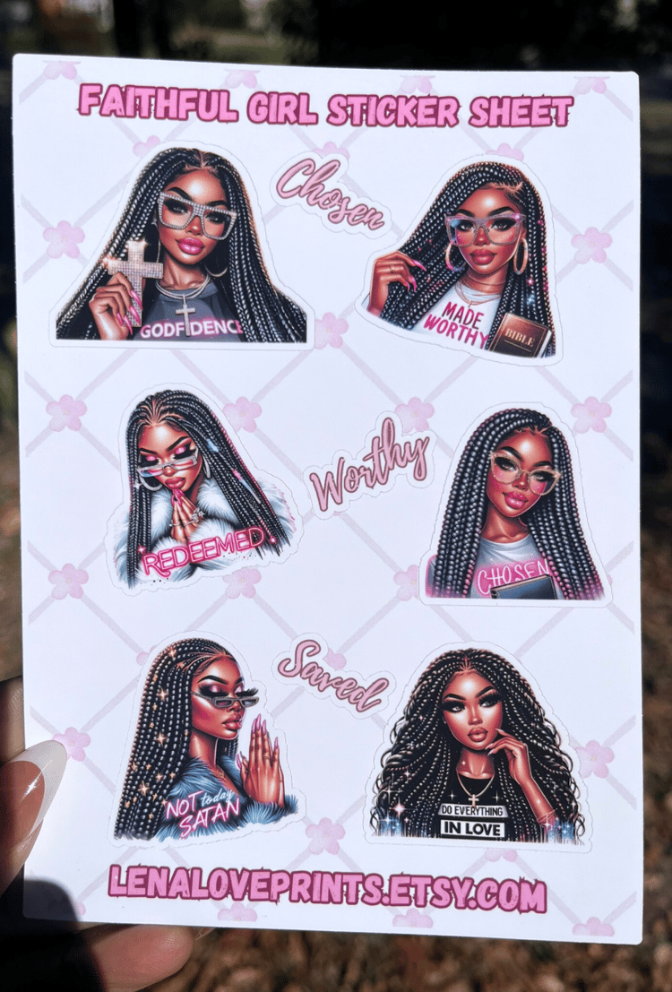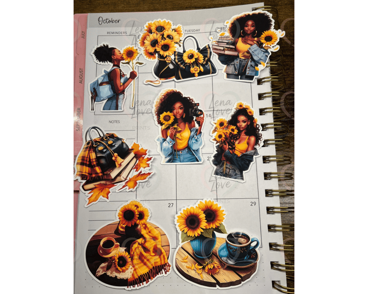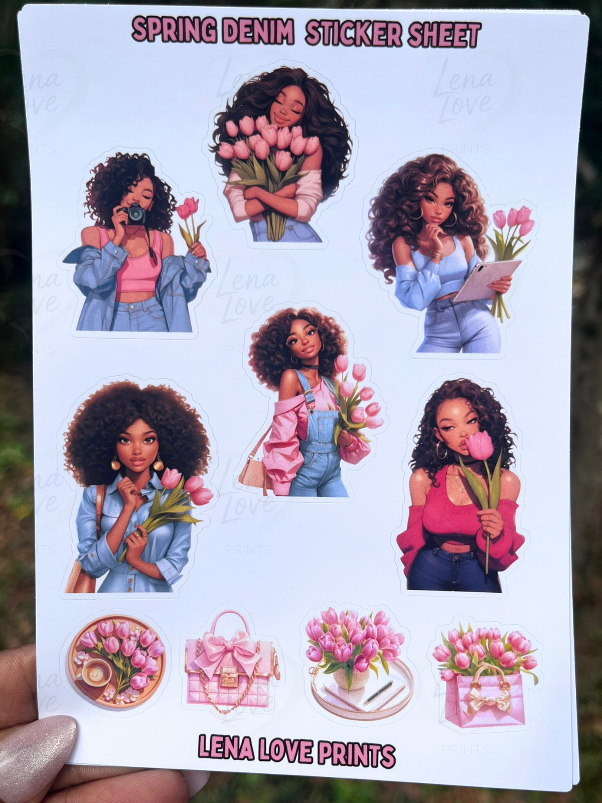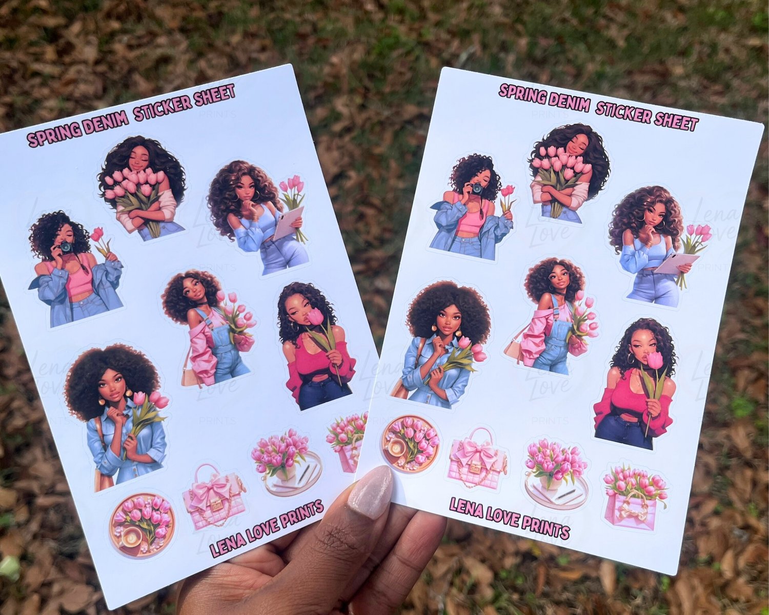 This 10-piece Spring Denim sticker sheet captures the joy of blooming season with floral vibes, soft pinks, and fresh fashion. Featuring beautifully illustrated Black women holding tulips, taking photos, and glowing in casual denim, these stickers bring light, color, and style to your stationery routine.