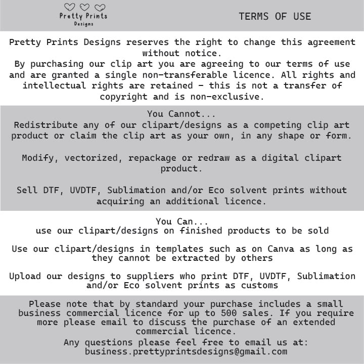 Please note that by standard your purchase includes a small business commercial licence for up to 500 sales. If you require more please email business.prettyprintsdesigns@gmail.com to discuss the purchase of an extended commercial licence.