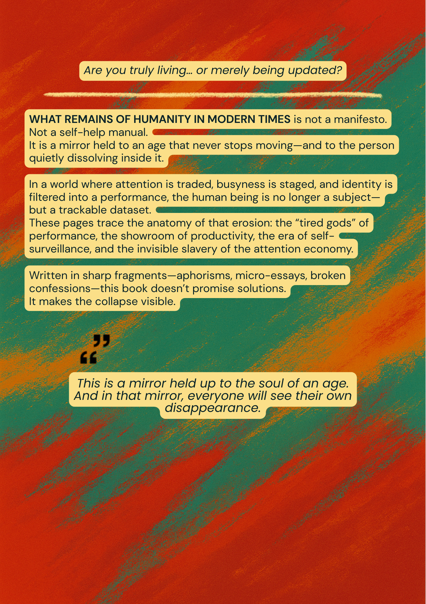 Told across six movements—from “tired gods” and staged busyness to self-surveillance and the attention economy—these pages unfold in short, sharp fragments: aphorisms, micro-essays, and unfinished thoughts, shaped like the modern mind itself: cut, interrupted, constantly pulled away.