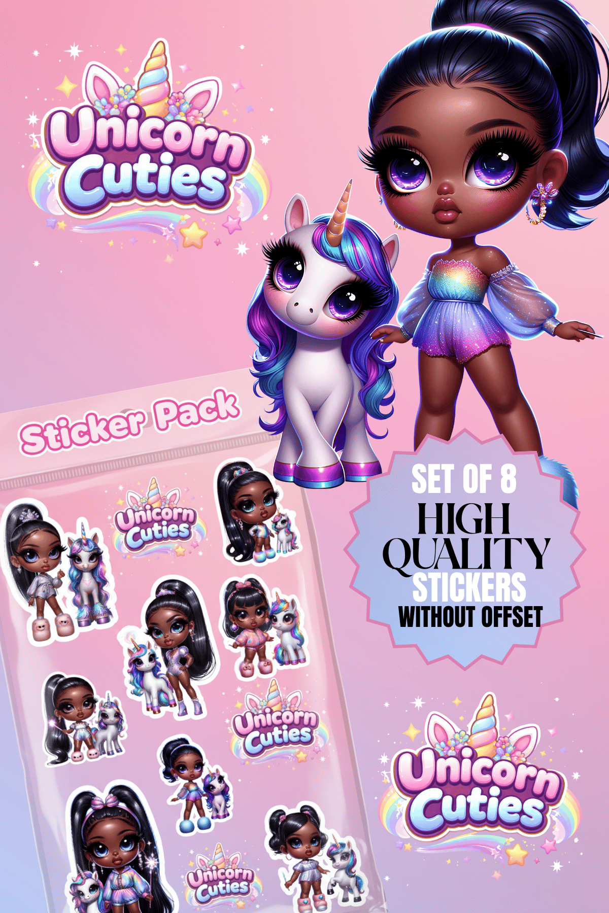 8 AFRICAN AMERICAN UNICORN CUTIES, PNG, STICKERS