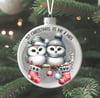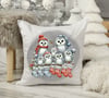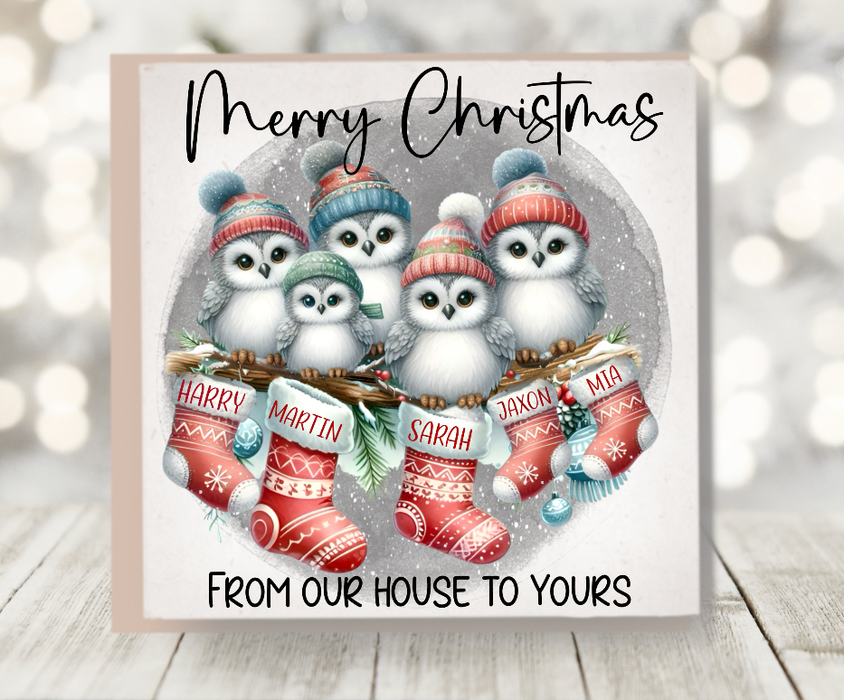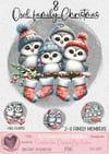 Cute Christmas owl family. 2-8 family members inc single parent plus couple. 8 complete designs on a round, grey watercolour background