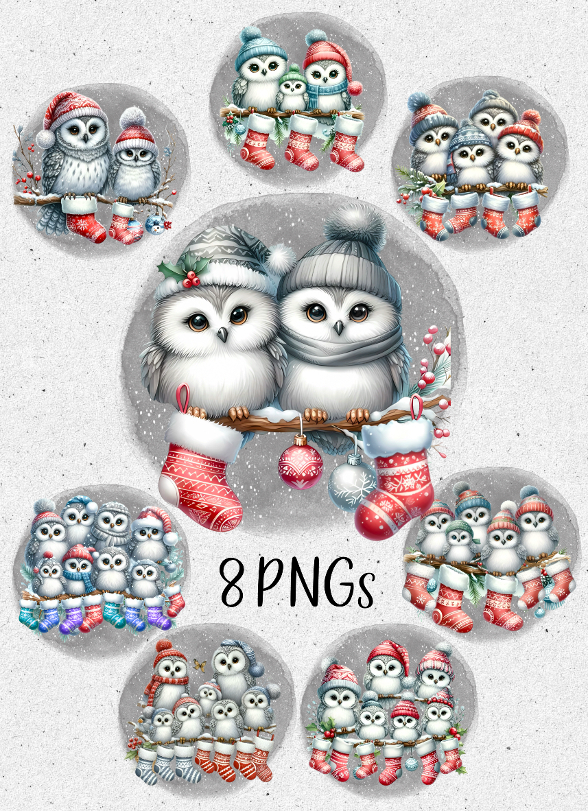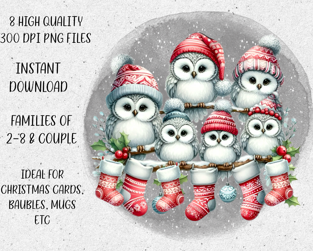 Cute Christmas owl family. 2-8 family members inc single parent plus couple. 8 complete designs on a round, grey watercolour background, PNGs. Sublimation, print, DTF etc. Please see pics for designs included.