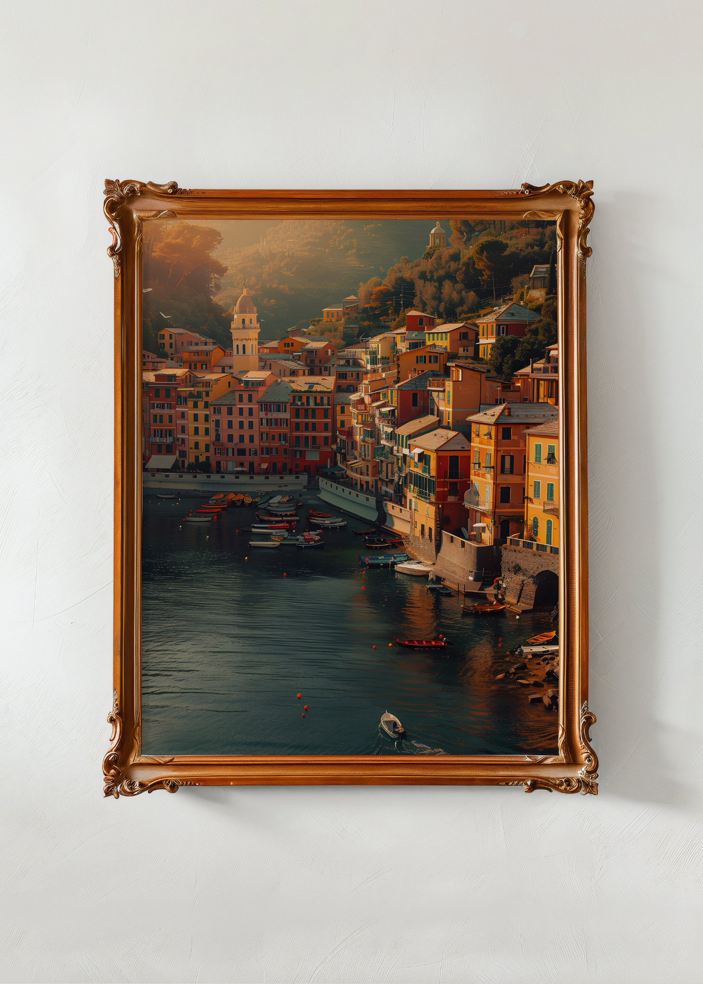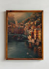 Golden Port View— Bathed in the amber glow of a setting sun, this dreamy coastal scene feels like the memory of a perfect day. Vibrant buildings in sun-washed hues of coral, marigold, and blush rise along the hillside, their shutters flung open to welcome the sea breeze. Little boats bob in the gentle water below, each one like a secret waiting to be discovered. In the distance, soft hills cradle a domed chapel and tower, echoing stories of quiet devotion and slow, unhurried living. This piece captures the essence of Italian charm—sun on your face, salt in the air, and a life steeped in beauty.