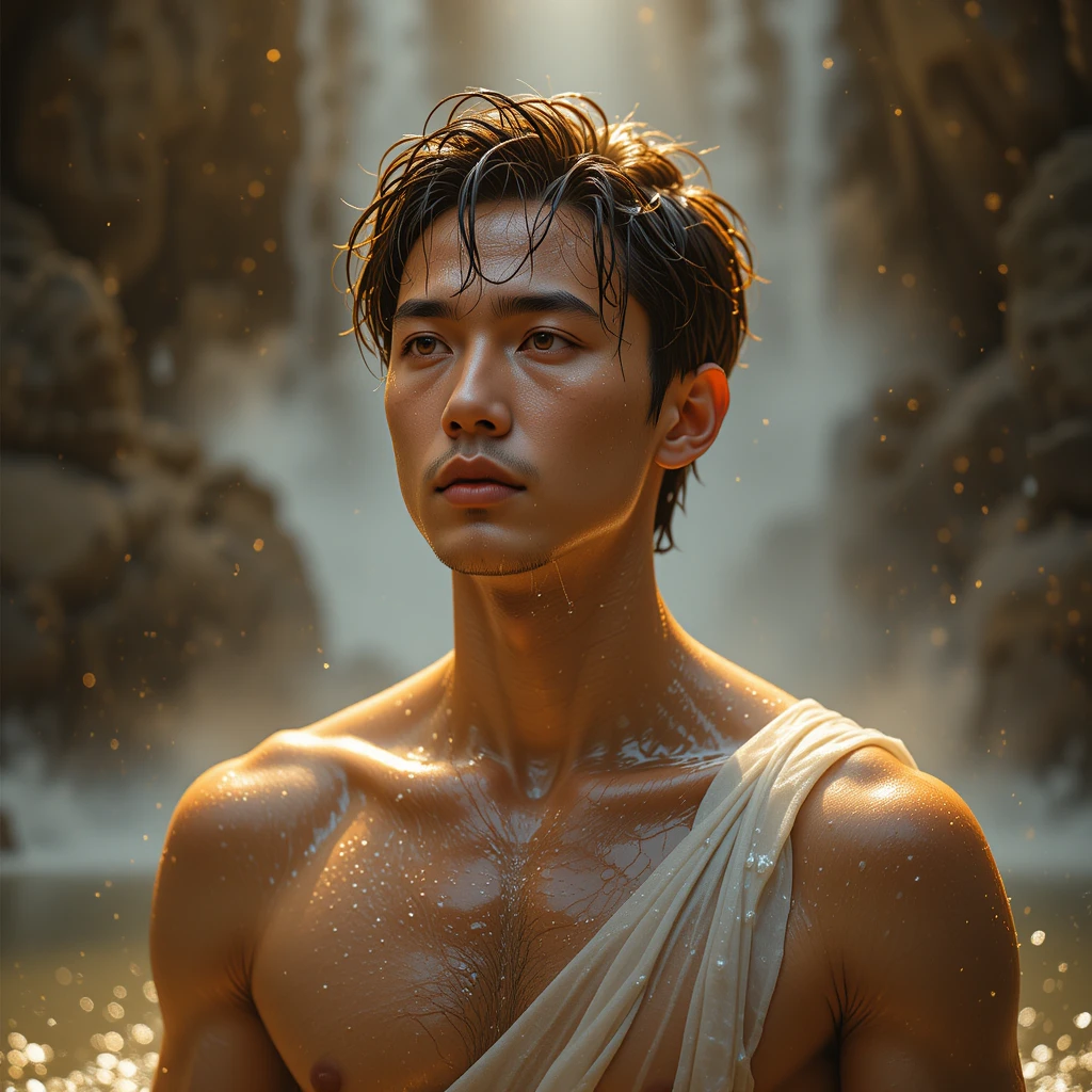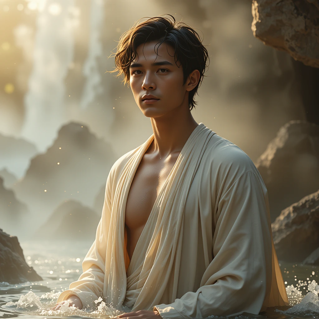 His short raven-black hair frames a diamond-shaped face, while his body merges gracefully with the surrounding waters — hands fully submerged, embodying rebirth, silence, and sacred stillness.