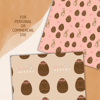 The Chocolate Easter Eggs Digital Paper Pack is a collection of five seamless patterns in chocolate brown and pink. The patterns feature candy Easter eggs, cute hopping Easter bunnies, and flowers.