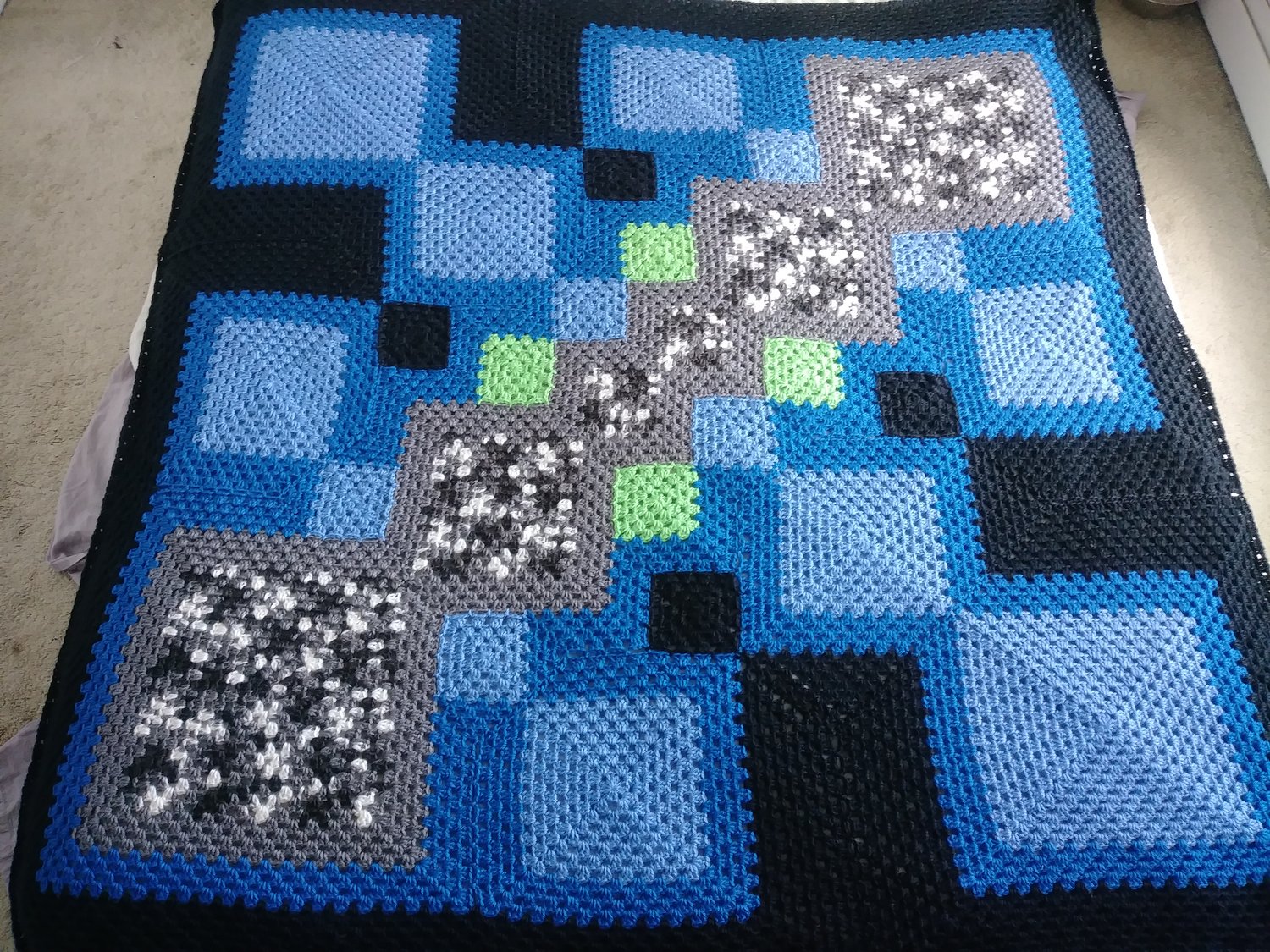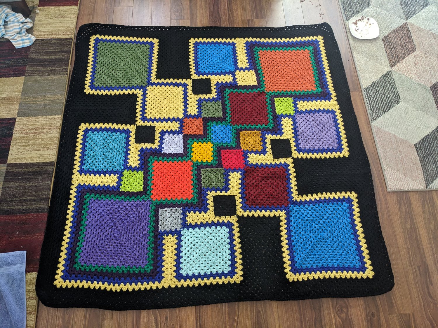 This pattern is easily resizable, and your finished blanket will measure approximately 16 times bigger than the smallest square in the pattern (labelled as “1” in the schematic, the smallest of the variegated squares in the pattern sample).