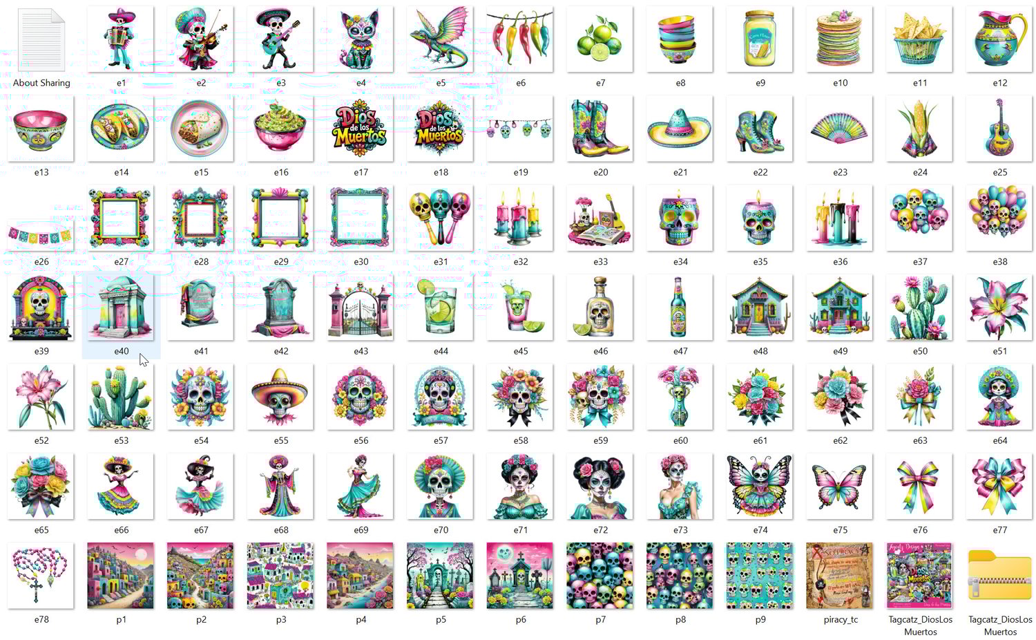Day of the Dead is a holiday of remembrance for those family or friends who have passed away. It usually involves food, music, and keeping memories alive. 78 elements and 9 matching papers. AI geneated. Tagger size. Not all shown.