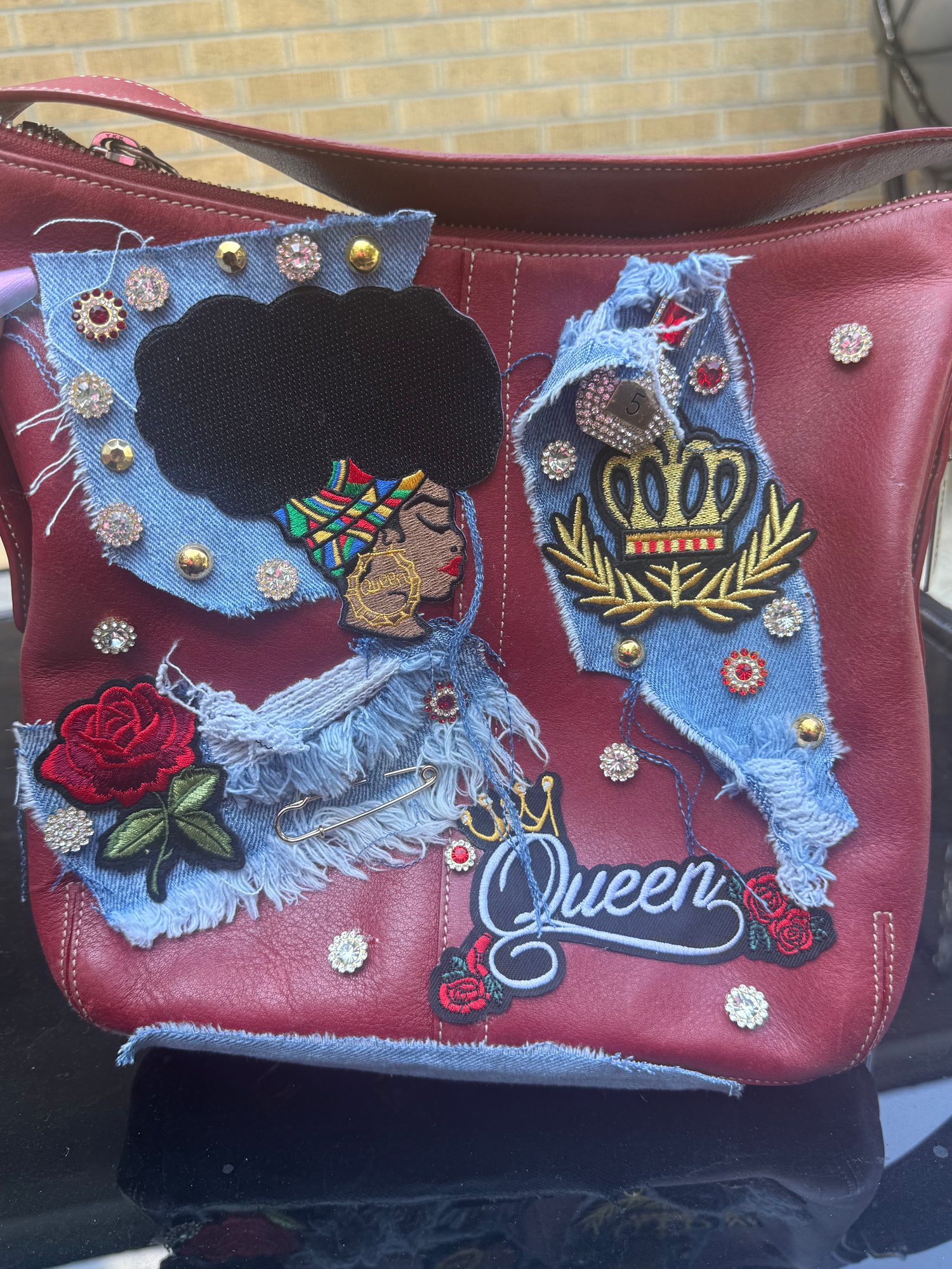 - Front: Explodes with denim patchwork, a bold embroidered Black Queen silhouette, crowned accents, jeweled studs, and rose appliqués. The “QUEEN” patch—framed with a stitched crown—cements your status without apology.