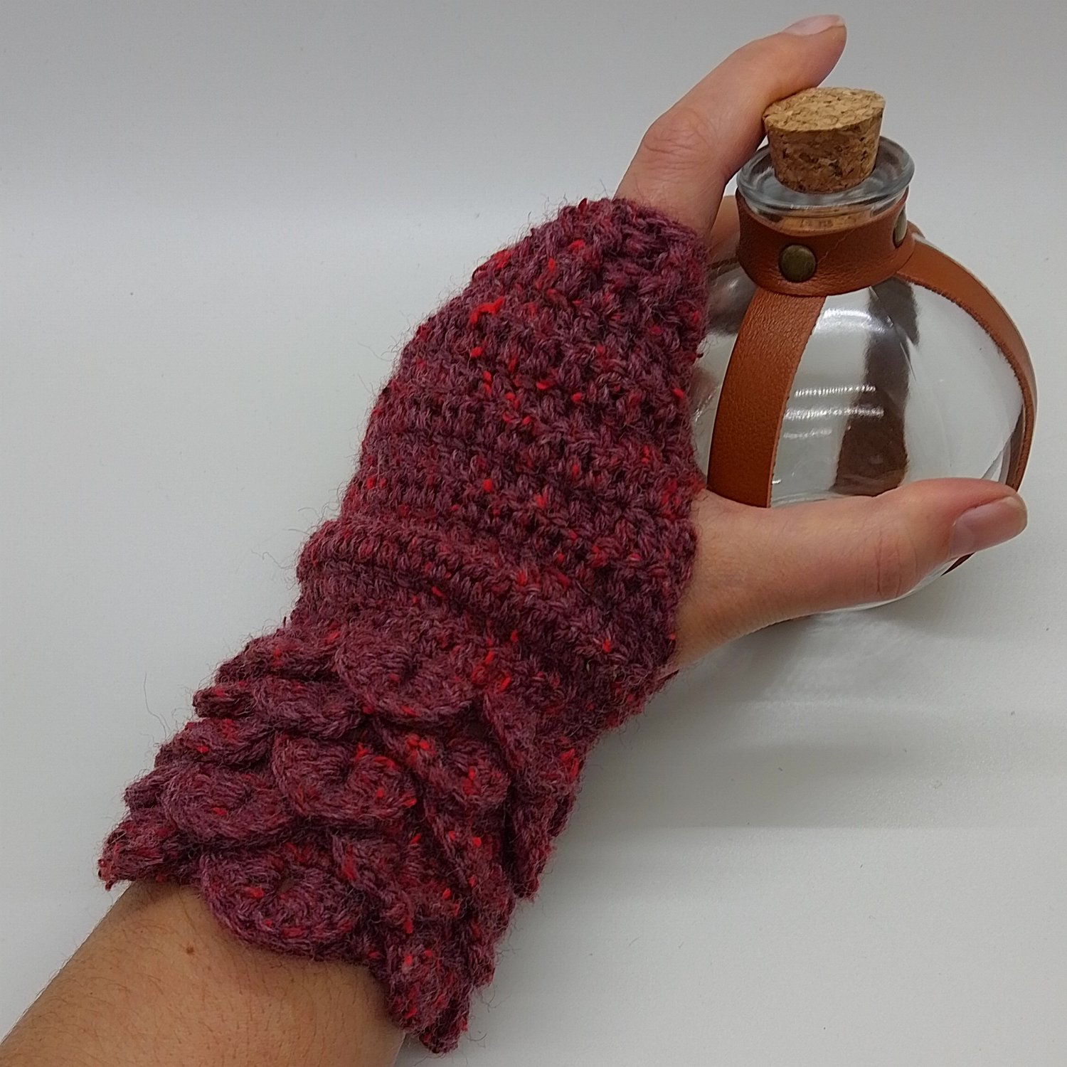 Downloads include the mitt pattern (UK & US terms) and a dragon scale crochet technique sheet (left and right handed versions, UK terms).