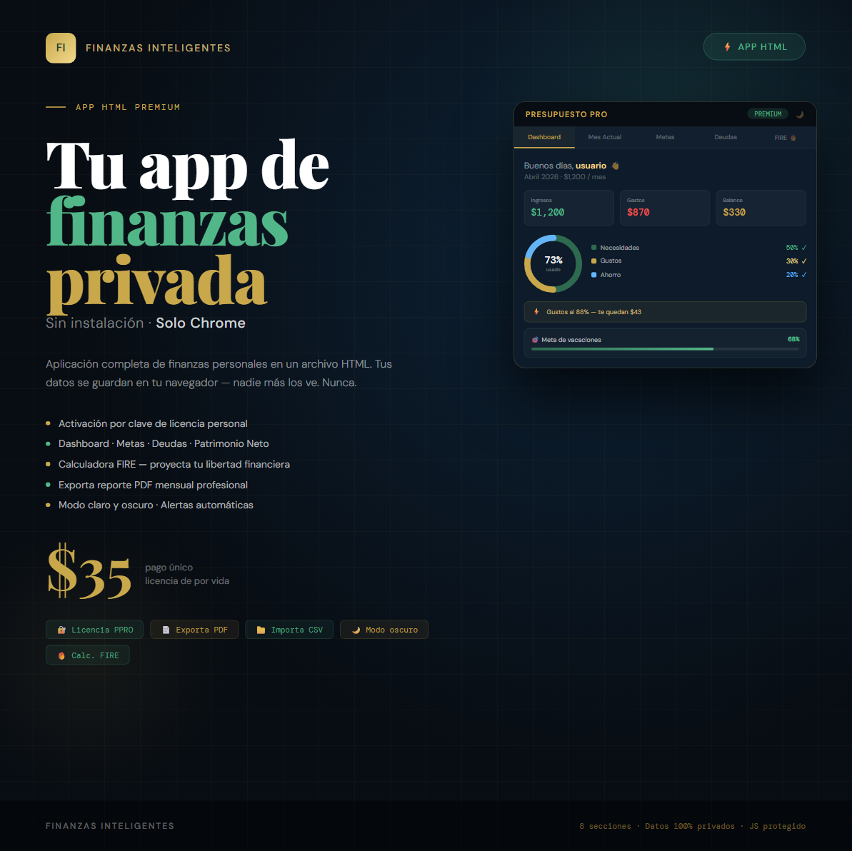 App HTML de finanzas personales. Sin instalación, sin suscripciones, 100% offline. Funciona en móvil y PC. Dashboard, metas, deudas y calculadora FIRE. Descarga instantánea, licencia de por vida.