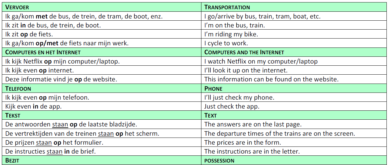 - Een lijst met voorzetsels, thematisch geordend, met voorbeelden en Engelse vertalingen.